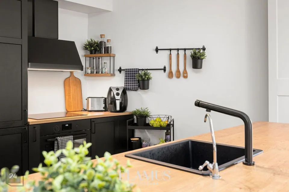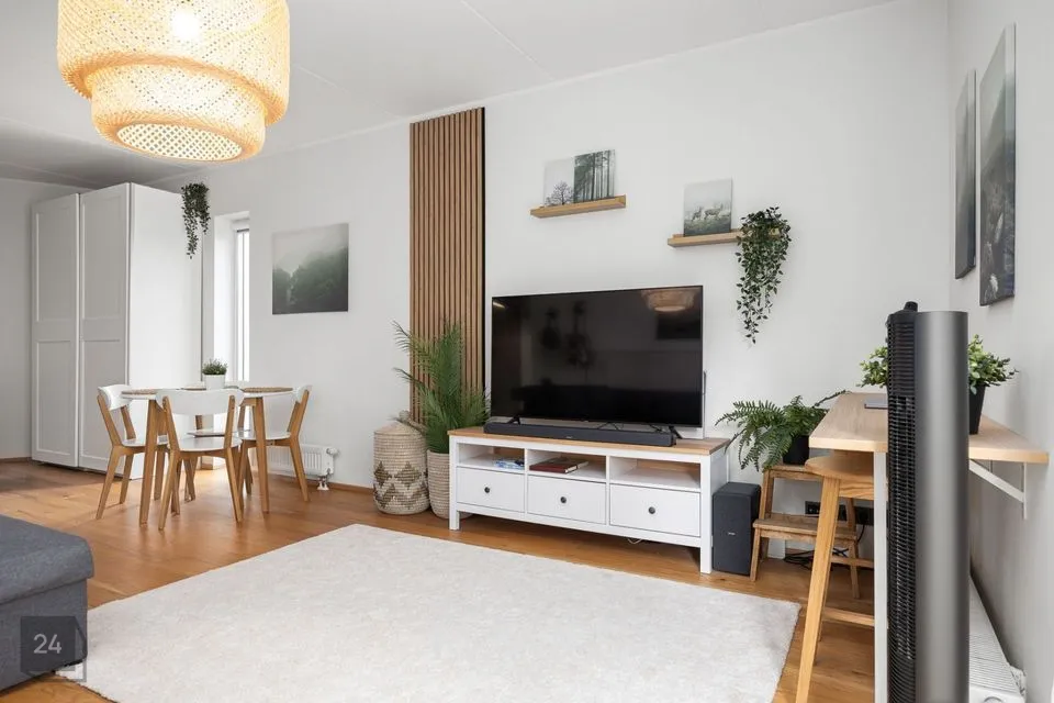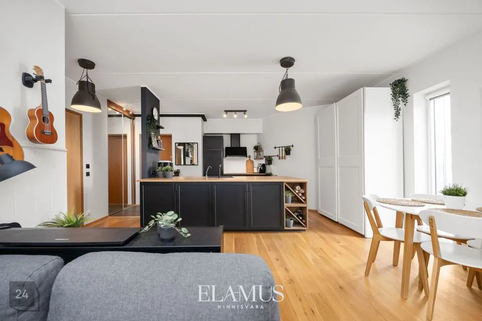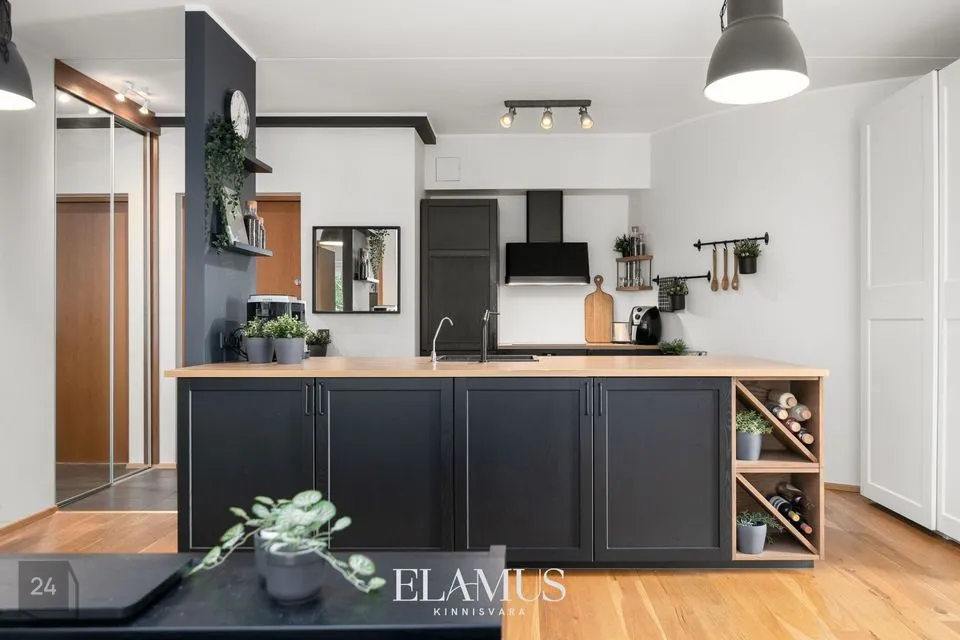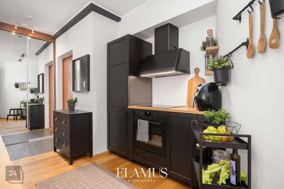 - vasakul avatud elutuba- köök, kus on kõik eluks vajalik olemas: köögimööbel koos tehnikaga: induktsioonpliit, ahi, kubu, nõudepesumasin ning külmkapp-sügavkülmikuga.