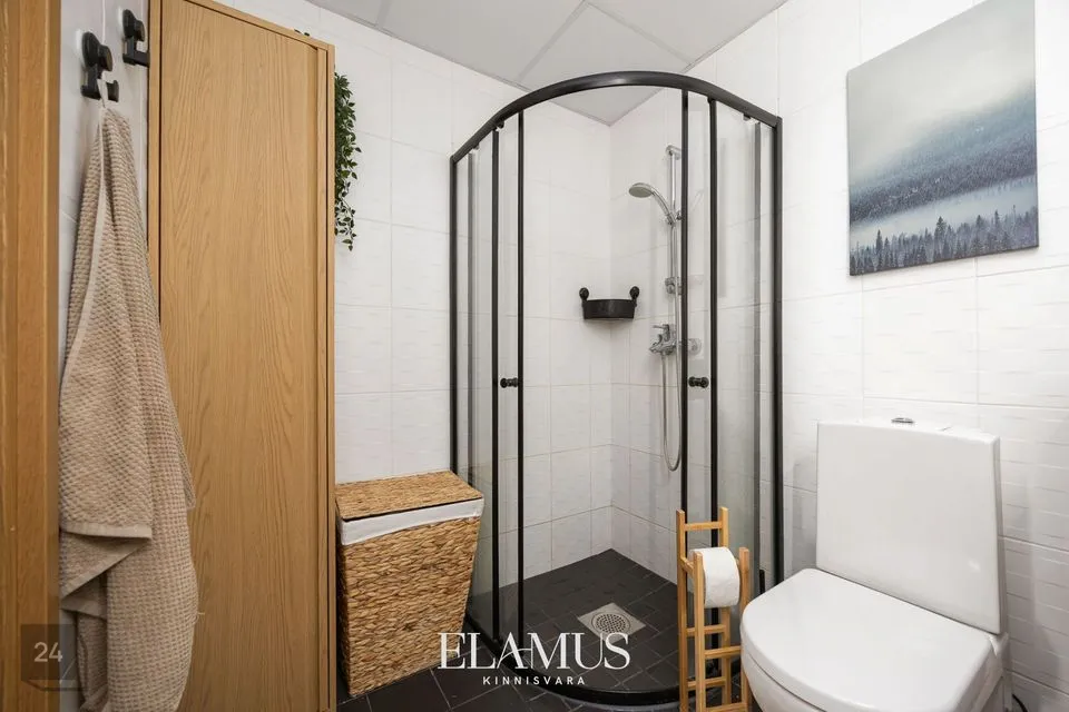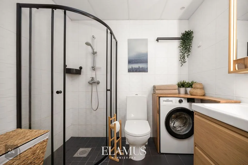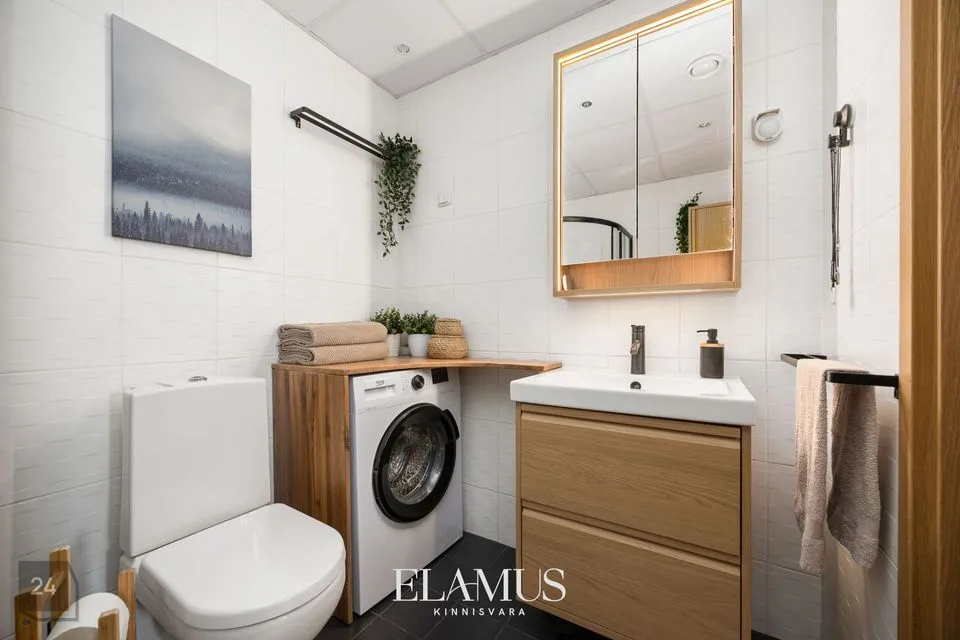 - esikust paremale jääb vannituba/wc, kus on dušš, kõrge kapp asjade tarvis, eestlaetav pesumasin, kraanikausi all kapp sahtlitega ning peegel kraanikausi kohal.