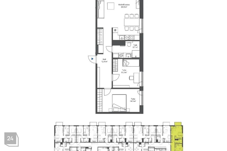 Korteri müügihinnas sisaldub köögimööbel koos Electrolux tehnikaga (külmik, nõudepesumasin, induktsioonpliit, küpsetusahi, köögikubu).