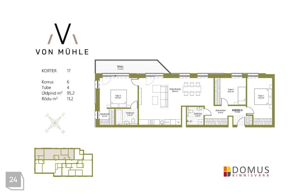 Eksklusiivne korter asub maja 6. korrusel ja on tõeliselt avarate vaadetega. Ruumilahenduses on avatud köögiga elutuba, kolm magamistuba, kaks vannituba ning rõdu. Peamagamistoal on eraldi vannituba ja walk-in garderoob.