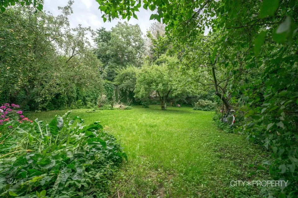 Kinnine ja hooldatud sisehoov lillepeenarde, õunapuude ja murualaga