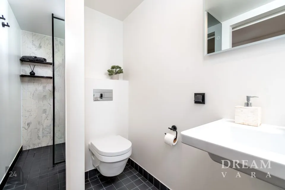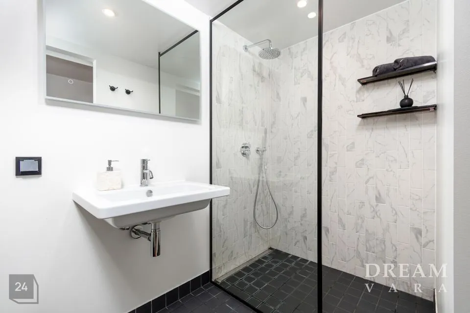 Vannitoa põrandad on kaetud tumedate keraamiliste plaatidega ning duššinurga seintele on paigaldatud hele keraamiline plaat, mis sobitub ülejäänud vannitoa seintega.
