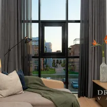 Siseviimistlus on heledates toonides, suured ruudustatud aknad loovad korteri kahele tasandile palju avarust ja valgust.