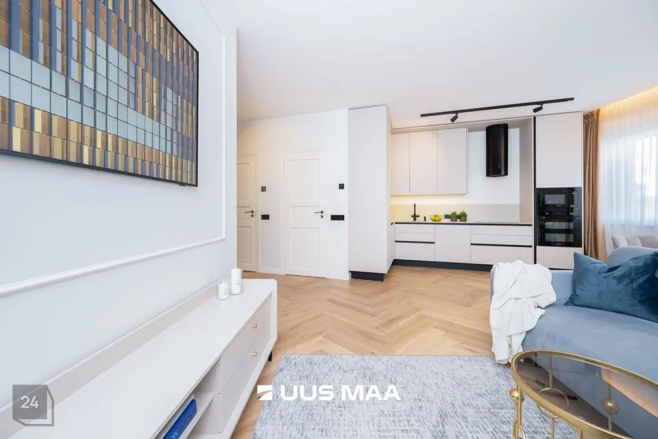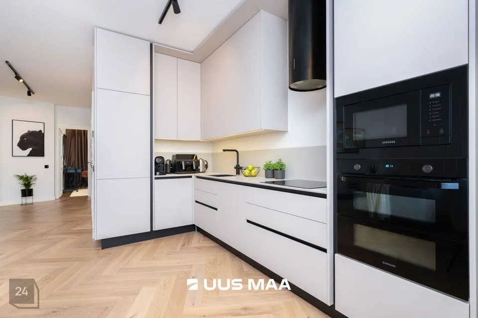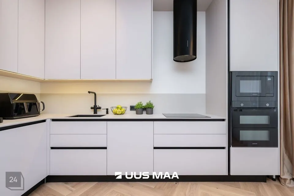 Köögimööbel ja sisseehitatud kapid on valmistatud eritellimusel, spetsiaalselt selle korteri jaoks. Põrandaid katab naturaalne kalasaba mustris tammeparkett, mille soe toon ja loomulik tekstuur lisavad korterile hubasust ning ajatut elegantsi.