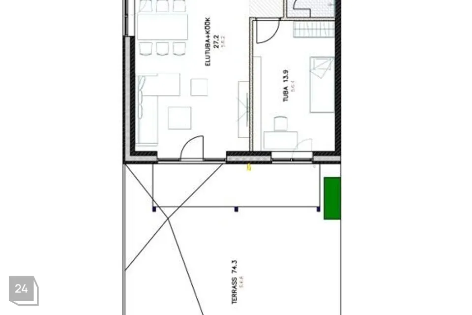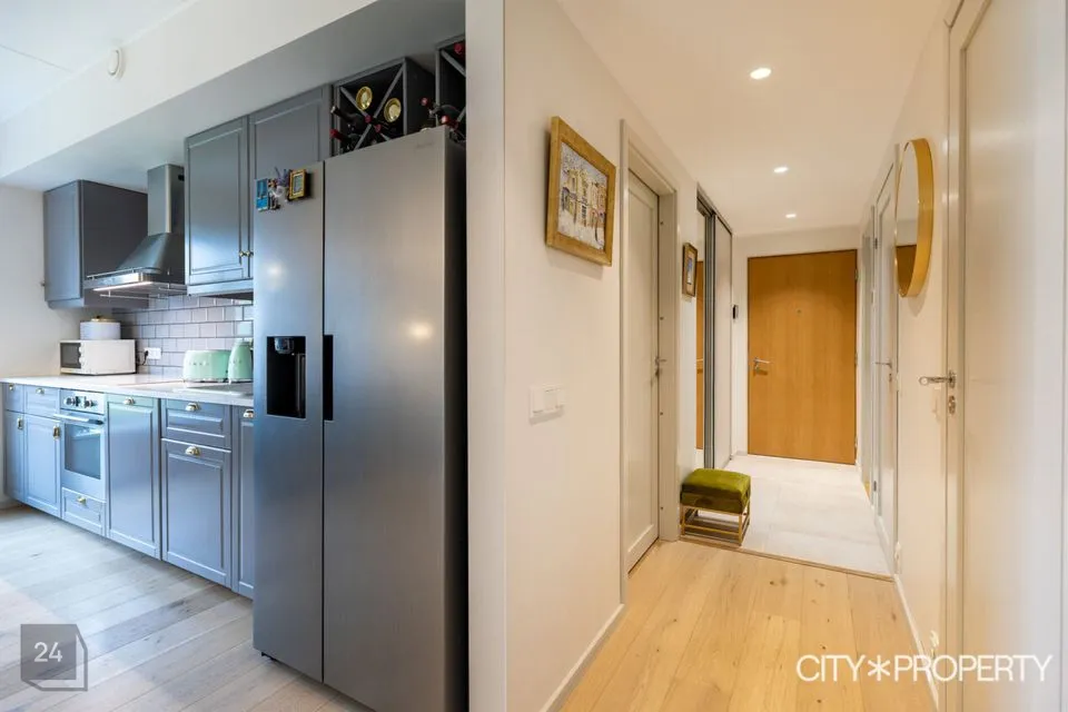 Korter koosneb 70,1 m² avatud köögiga elutoast, kahest magamistoast, ühest duširuumist koos WC-ga, eraldi WC-st, koridorist ning 2,4 m² majapidamisruumist. Esikualal on sisseehitatud garderoobikapp. Elutoa ja magamistoa suured aknad lasevad tuppa sooja õhtupäikese valguse. Elutoast pääseb väga suurele, 74,3 m² terrassile.