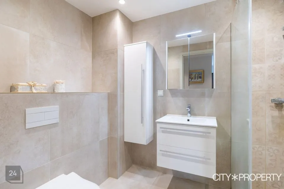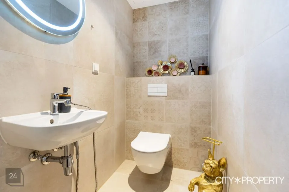 Vannitoas on dušinurk ja WC. Sanitaarruumides on kasutatud kvaliteetseid Hansgrohe segisteid ja Villeroy & Boch sanitaarkeraamikat.