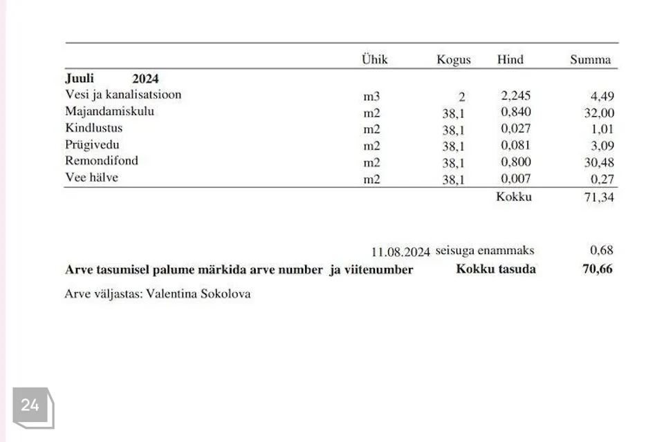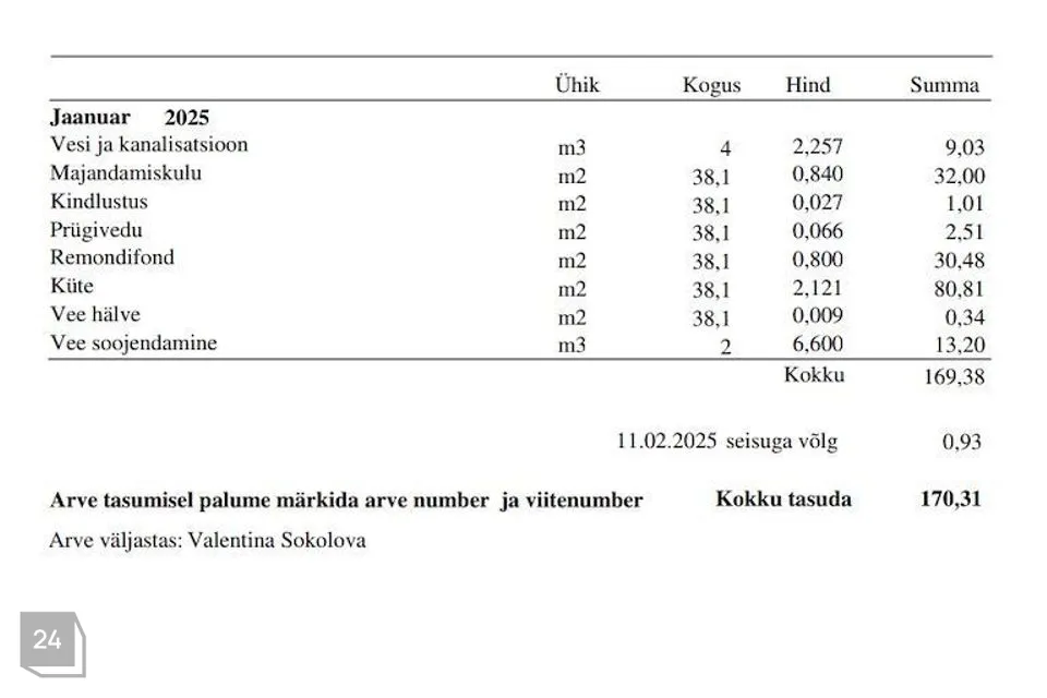 Kommunaalkulud on korterit mõistlikud, jäädes suvel 70€ juurde ja talvel 170€ juurde. Näidised arvetest on lisatud galeriisse.