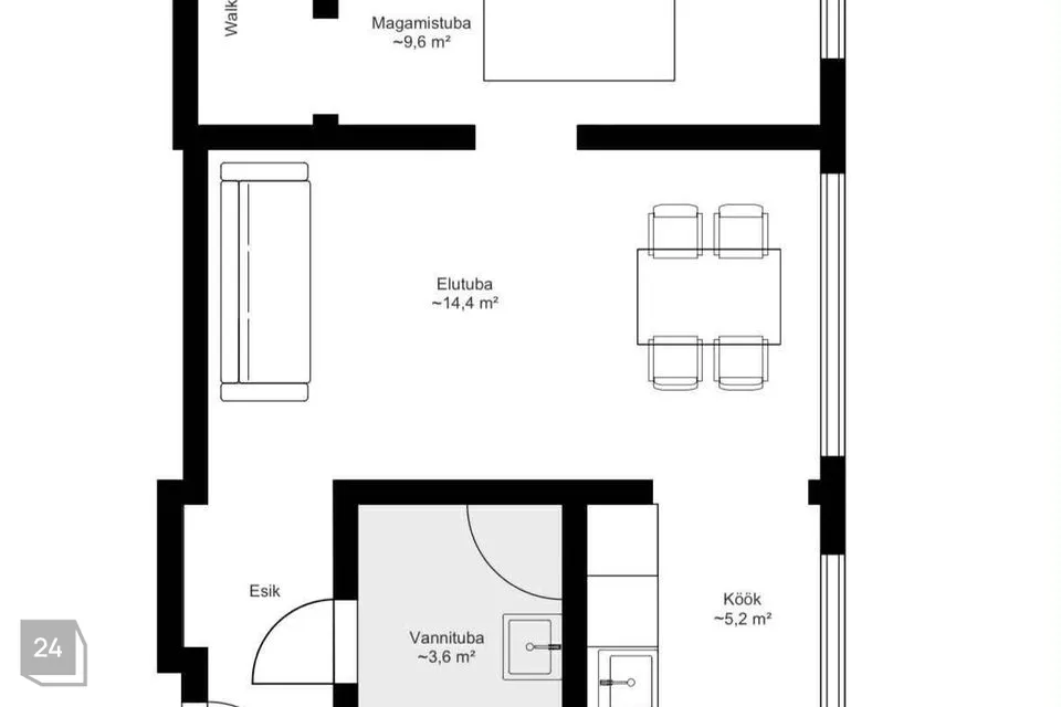 Korteri planeering on praktiline - avar elutuba koos poolavatud köögiga, privaatne magamistuba, eraldi panipaik/garderoob, esik ja funktsionaalne duširuum koos tualetiga.