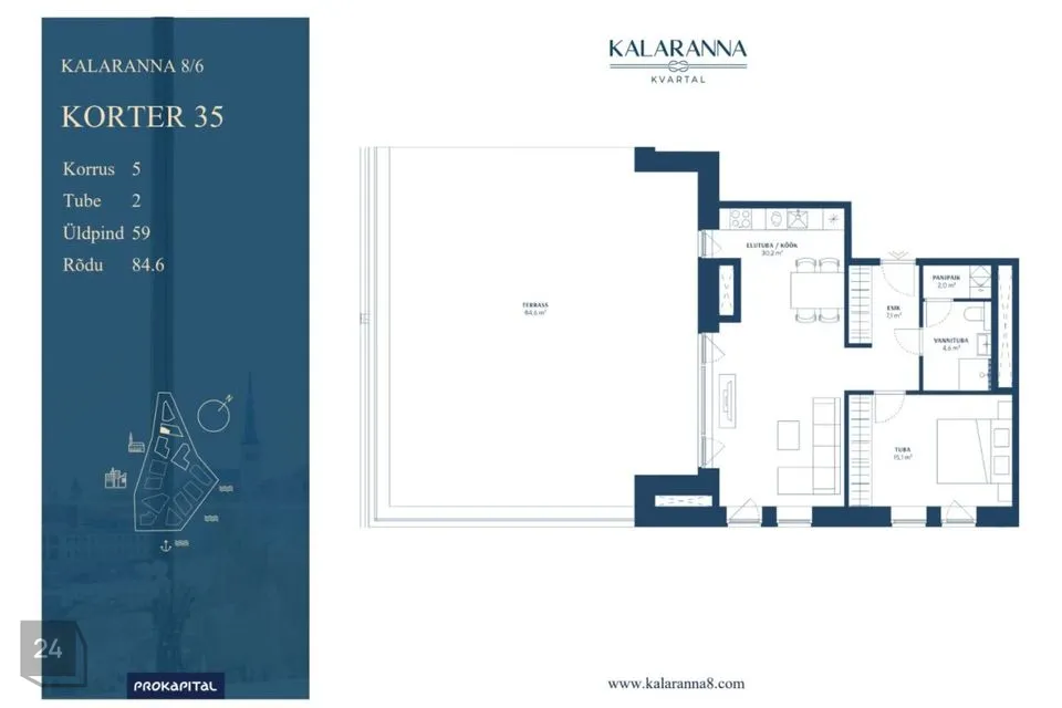 Kalaranna 8/6 hoone viimasel korrusel on saadaval eksklusiivse siseviimistlusega korter, kus märksõnadeks on must kalasaba parkett, tumedad plaadid vannitoas, jahutus, vaade sisehoovile ja linnale suurelt terrassilt.
