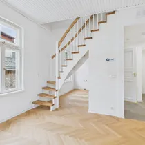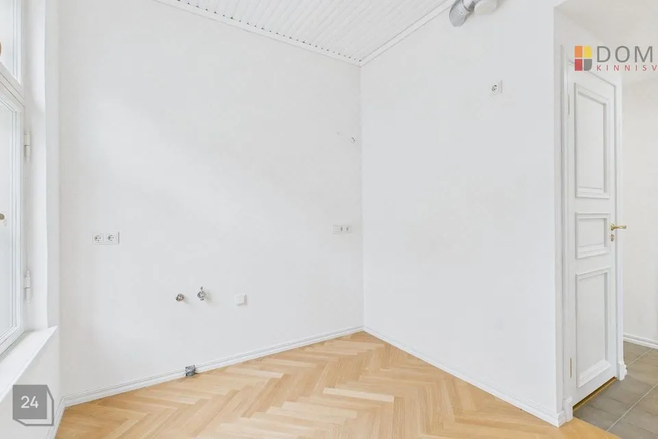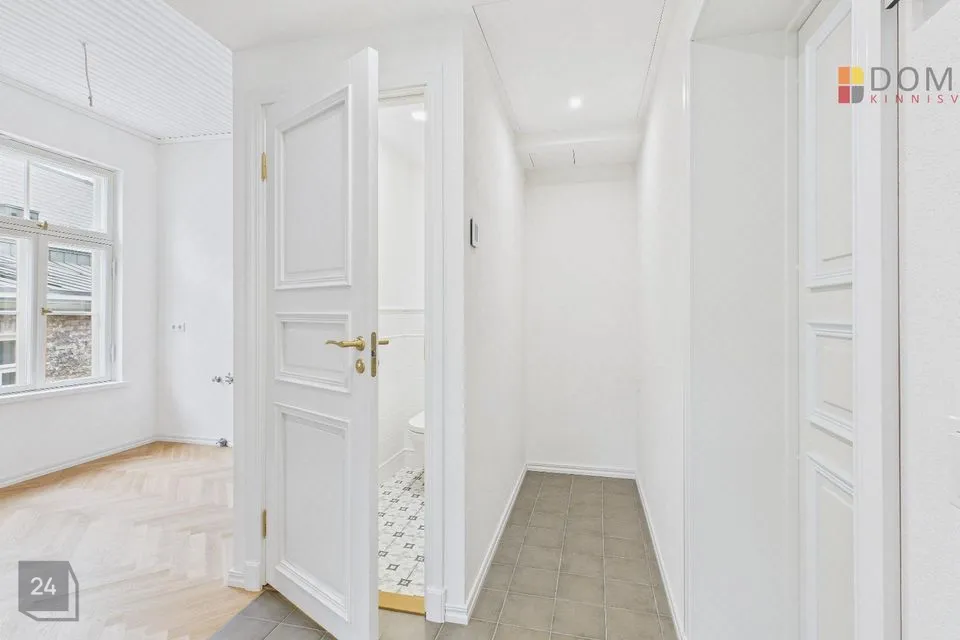 Muinsuskaitsealusele majale väärikalt rõhutasime selle ajastut kvaliteetsete materjalidega tänapäevases võtmes. Puitparkett kalasabamustris, puitlaudis koridori seinal ja elutoa laes, ehisdetailidega keraamilised plaadid vannitoas. Kogu korteri seinu katab samuti looduslik materjal - lubikrohv, mis jätab kergelt struktuurse lõpptulemuse ja on omaette vaatamist väärt.