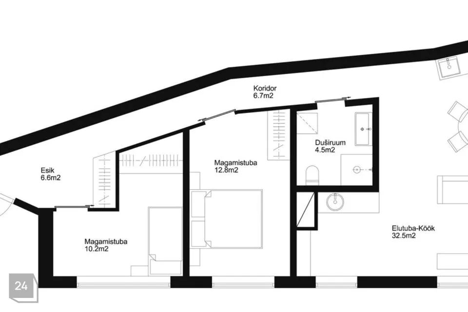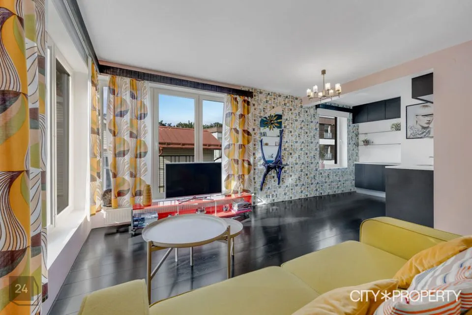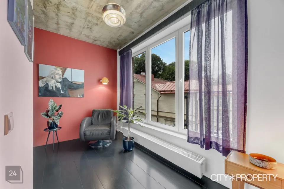 Rikkaliku ajalooga Tatari tänaval, põneva ja sihvaka vormiga kortermaja kolmandal korrusel asub isikupärase stiiliga kujundatud kodu, mille suured aknad avanevad päiksepoolse siseõue suunal. Pikliku planeeringuga korteri ühes otsas asub sissepääs koos garderoobiga ning teises otsas avar, läbi korruse ulatuv elutuba koos köögiga. Looklevate seintega pikast koridorist pääseb kahte magamistuppa ning duširuumi koos tualetiga.