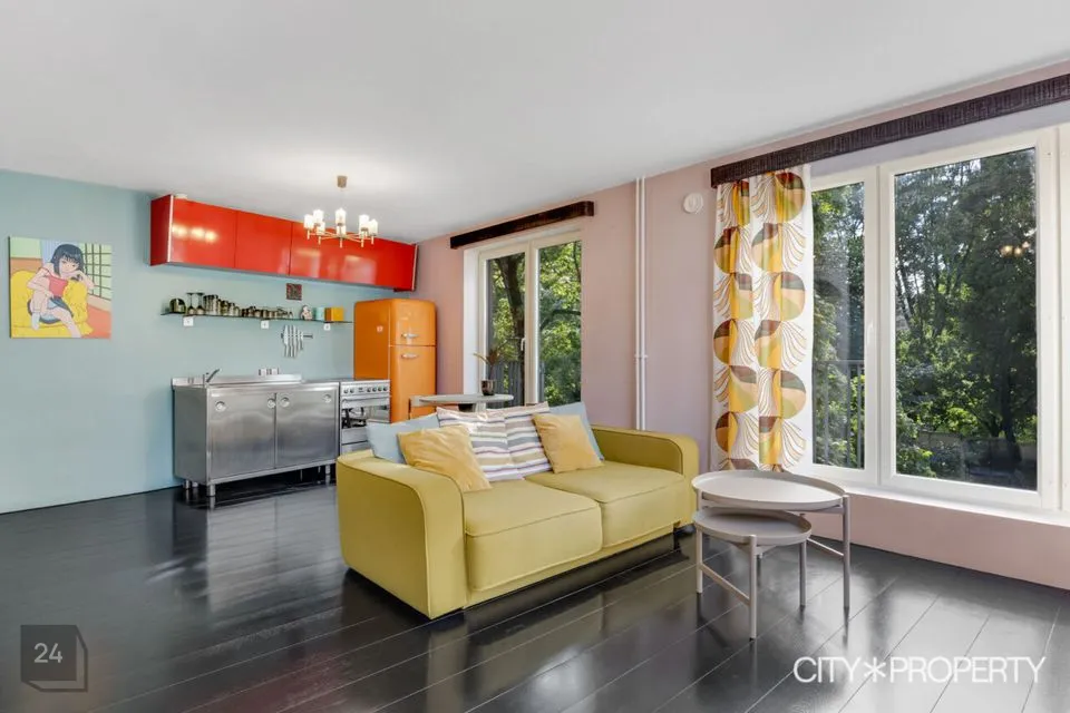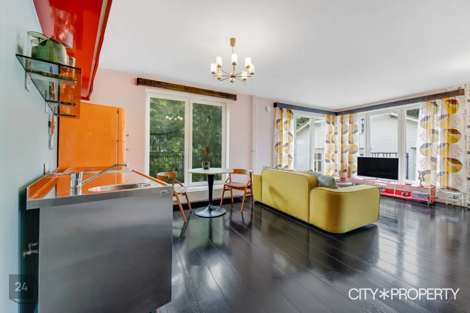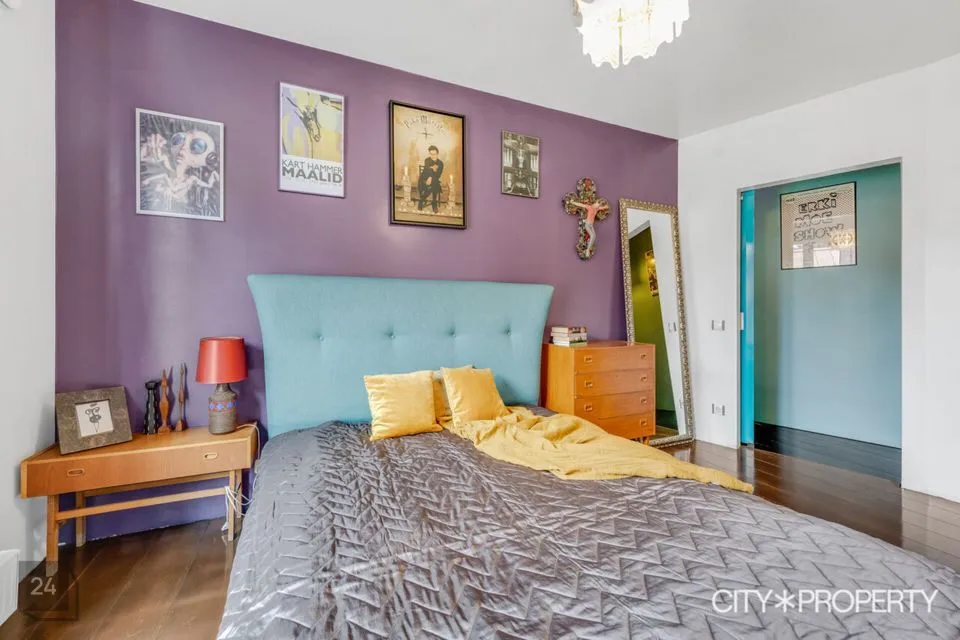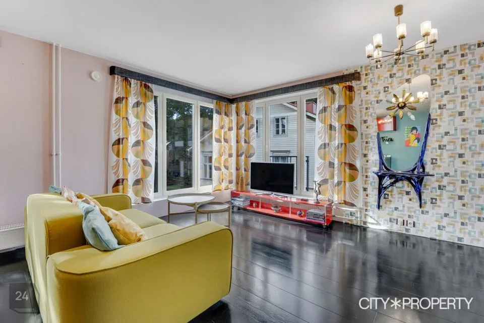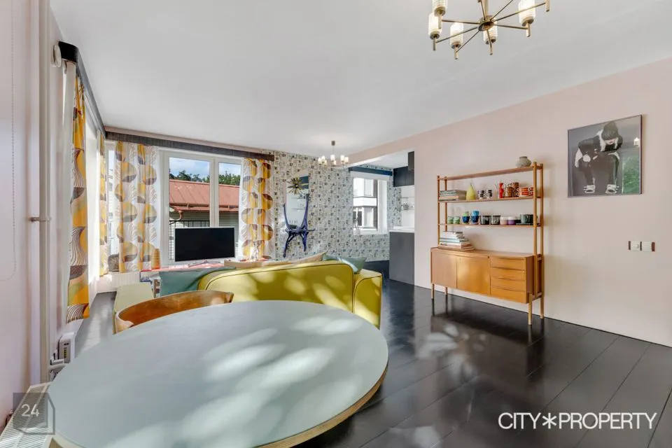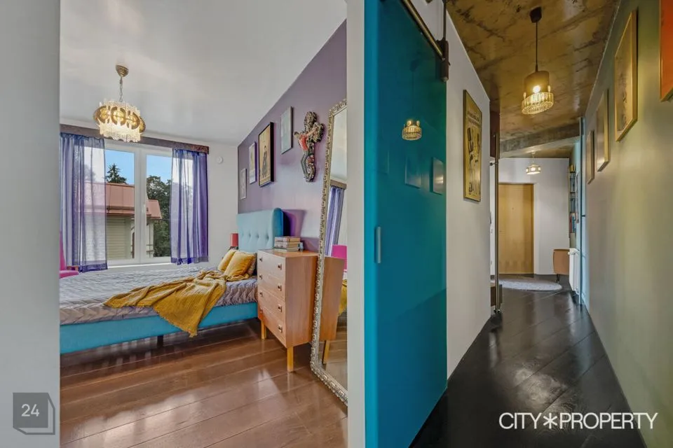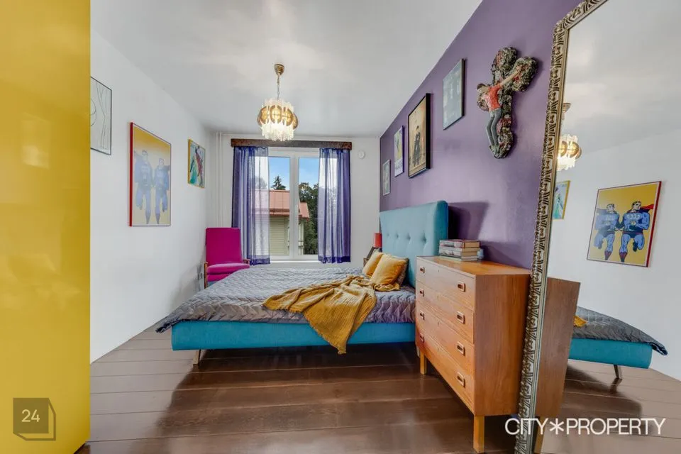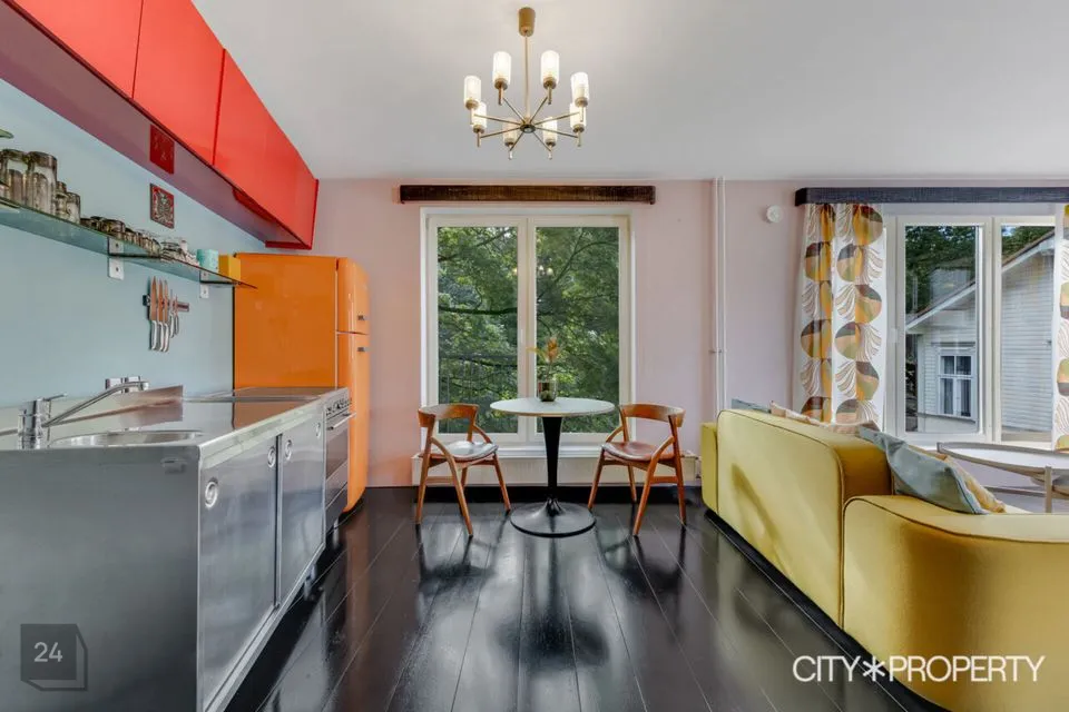 Siin kodus on värve ja karismat, põrandatel on musta värvi laudparkett, lagede materjaliks väljapuhastatud pinnaga lakitud betoon. Siseustena on kasutusel värvilisest klaasist lükandpaneelid. Mõlemas magamistoas on sisseehitatud garderoobikapid. Kirevust lisavad erksavärvilised mööbliesemed, geomeetrilise graafikaga kardinad elutoas ning retrošikid rippvalgustid ruumide laes.