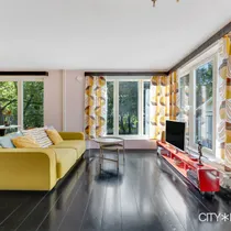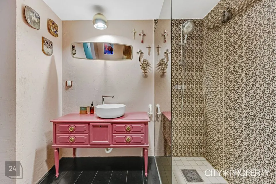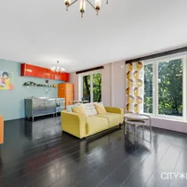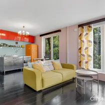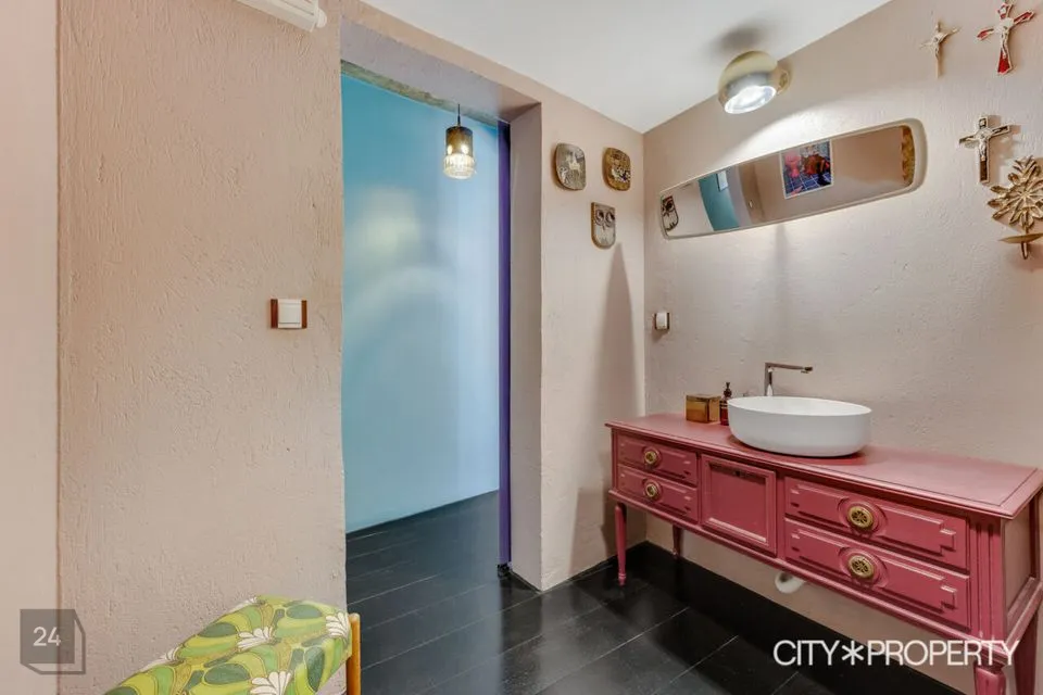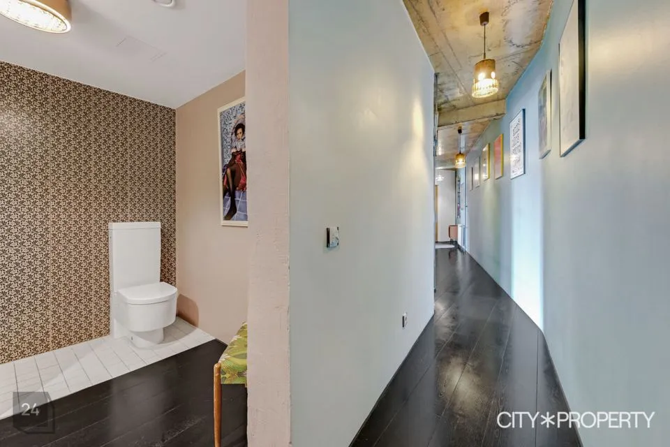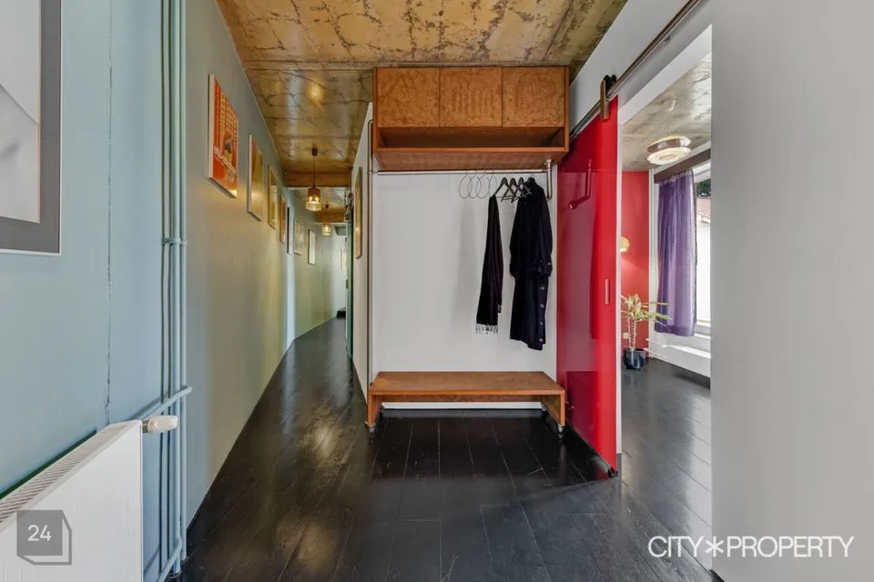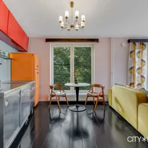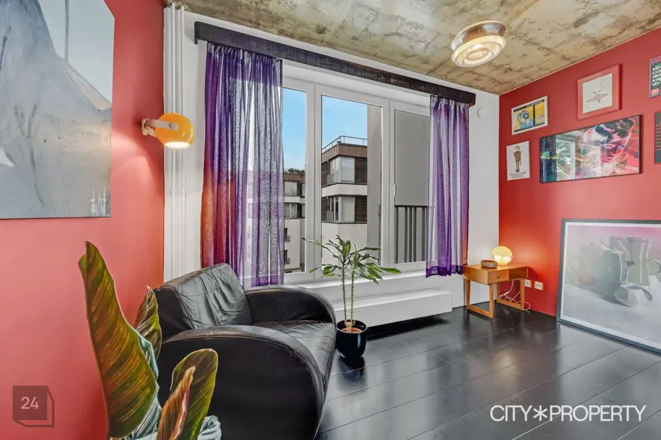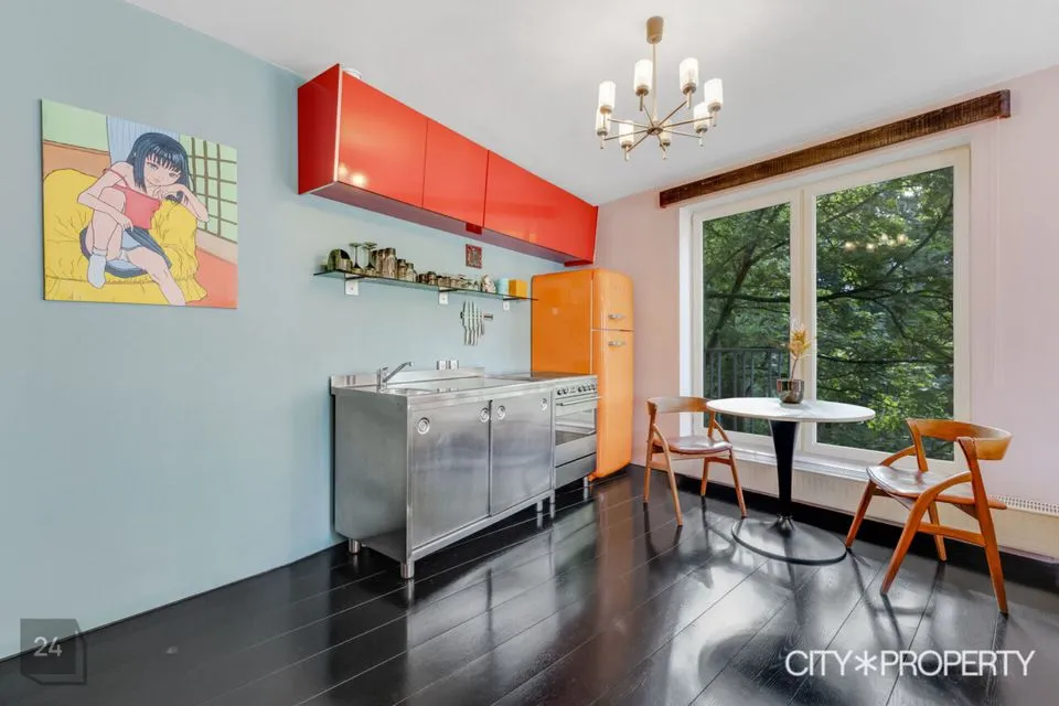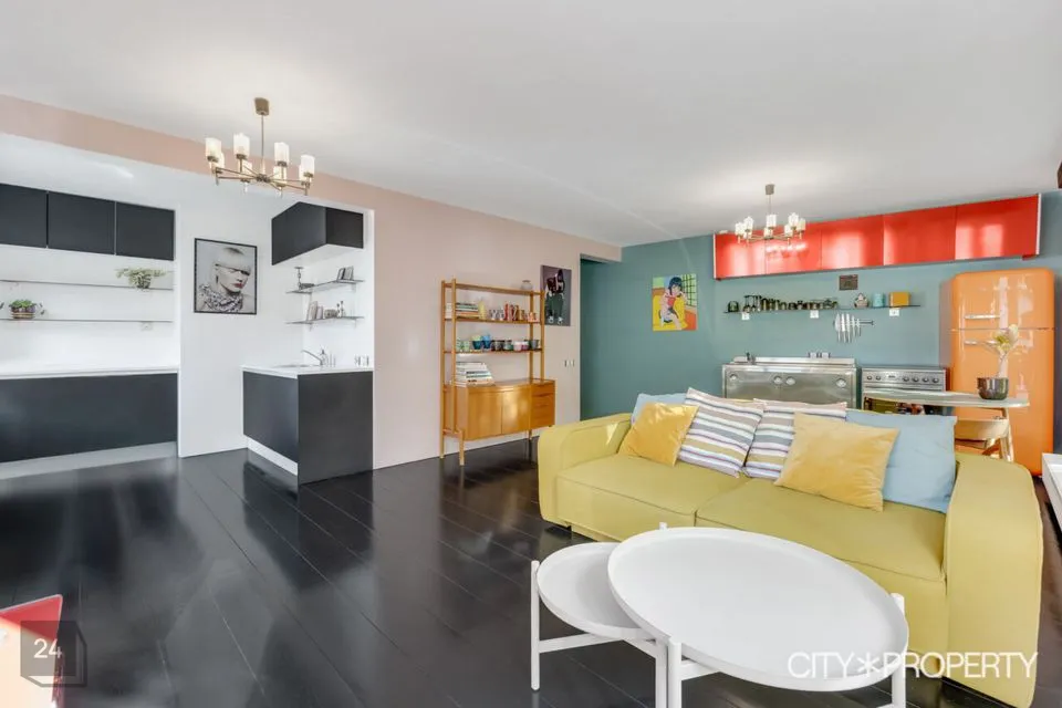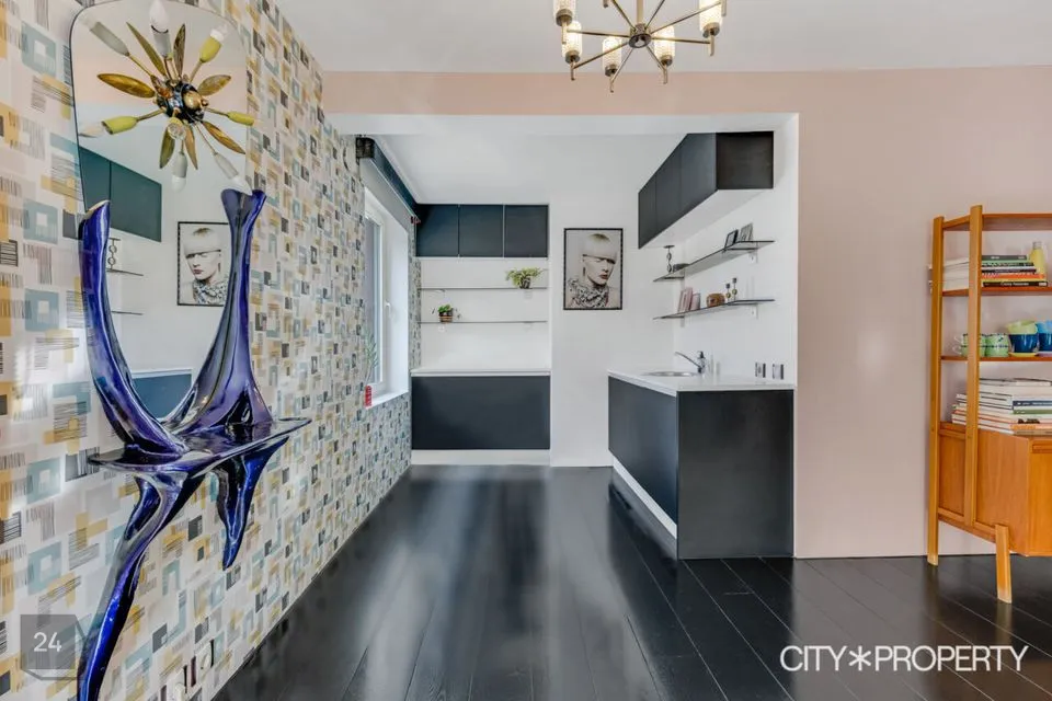 Siin kodus on värve ja karismat, põrandatel on musta värvi laudparkett, lagede materjaliks väljapuhastatud pinnaga lakitud betoon. Siseustena on kasutusel värvilisest klaasist lükandpaneelid. Mõlemas magamistoas on sisseehitatud garderoobikapid. Kirevust lisavad erksavärvilised mööbliesemed, geomeetrilise graafikaga kardinad elutoas ning retrošikid rippvalgustid ruumide laes.