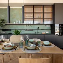 Sisekujunduse on loonud Loreida Hein, kes on kirjeldanud korterit järgmiselt: "Sisustuse koloriit on nauditavalt naturaalne, et siiski mitte värvivaene – tooni annab jahedam salvei- ja soojem samblaroheline, särama panevad interjööri laia varjundiskaalaga vase-, messing- ja pronksitooni metalldetailid ning sügavuse loob musta-valge kontrast. Naturaalne hele tammepuit selle sees. Tugeva rahuliku fooni tekitab võrgulise struktuuriga merehall kardinakangas. Mööbli osas on tehtud valikud võimalikud kohalikud - rõõm nii keskkonnale kui ka siinsele majandusele. "