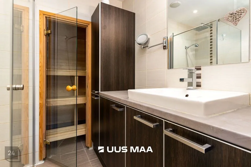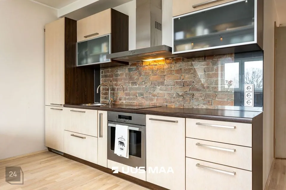 Funktsionaalne köögimööbel koos integreeritud kvaliteetse köögitehnikaga: induktsioonpliit, ahi ja nõudepesumasin. Lisaks on olemas mikrolaineahi, õhupuhasti, külmkapp.