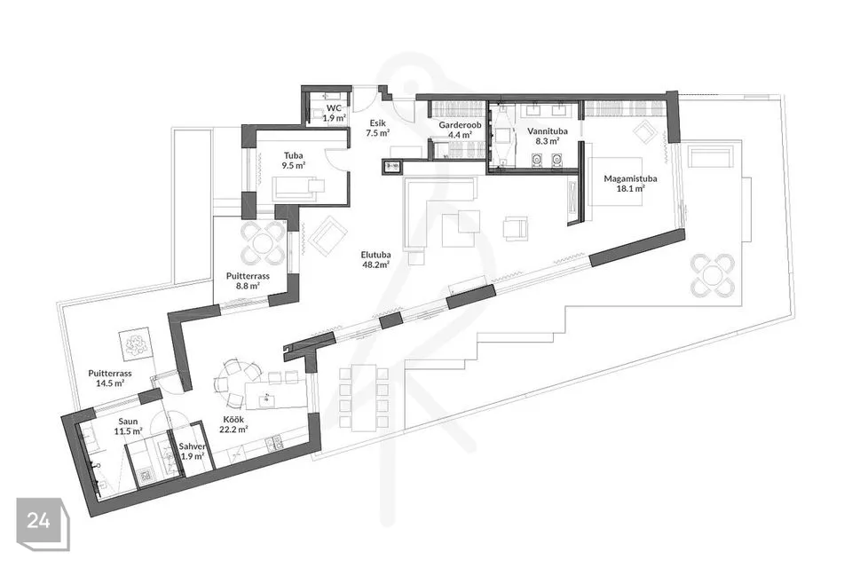 Korteri koosseisu kuuluvad esik, garderoob, elutuba, köök, sahver, 2 magamistuba, 2 vannituba, WC, saun, majapidamisruum ning 2 terrassi.