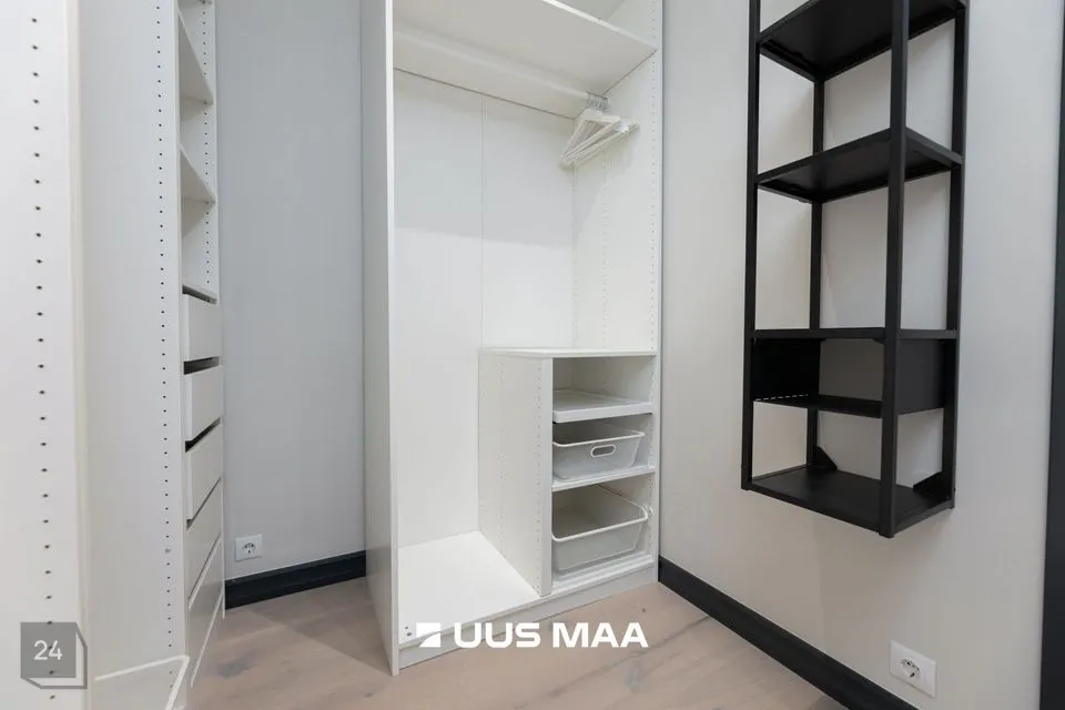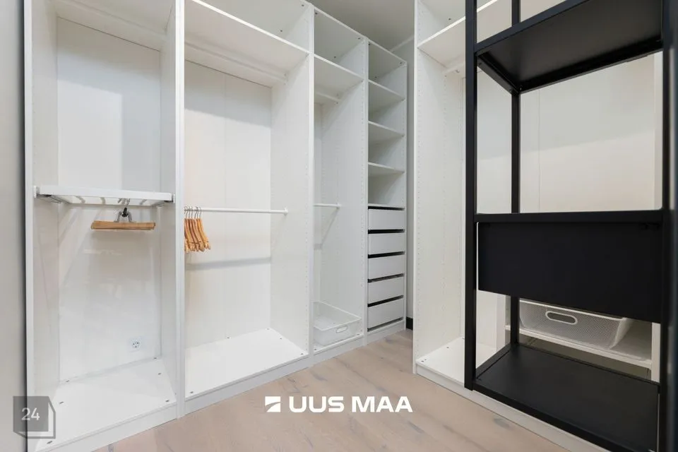 Magamistuba: walk-in garderoob nelja integreeritud kapiga, must riiul, automaatsed rulood ja kardinad.