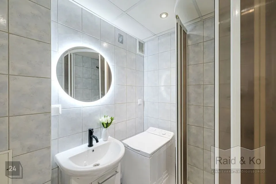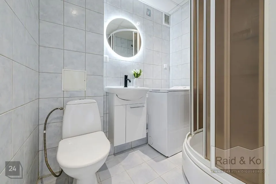 Vannitoas on põrandaküte, uus vannitoamööbel ja pesumasin.