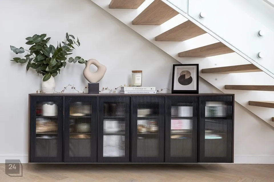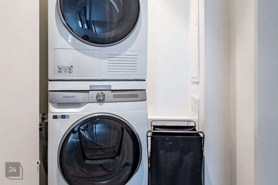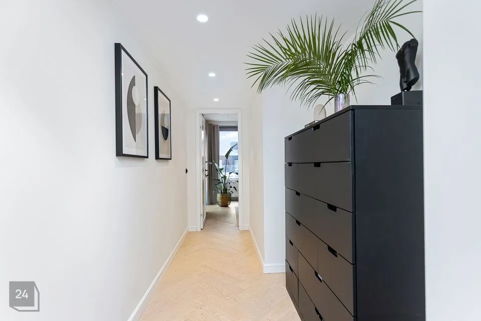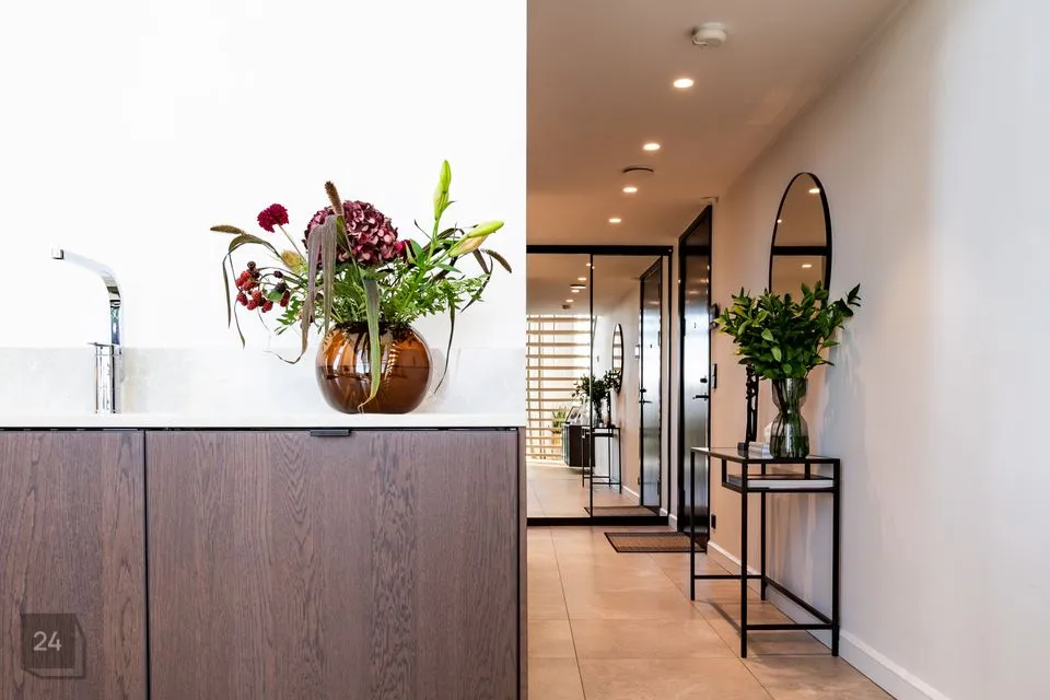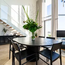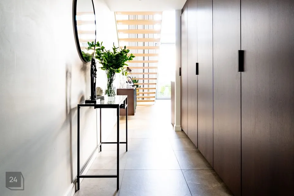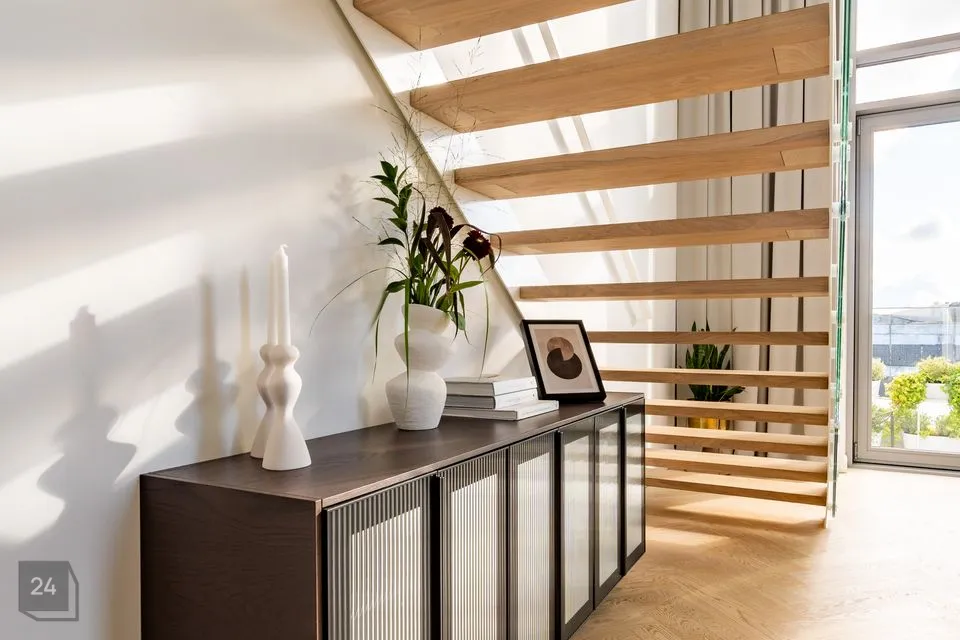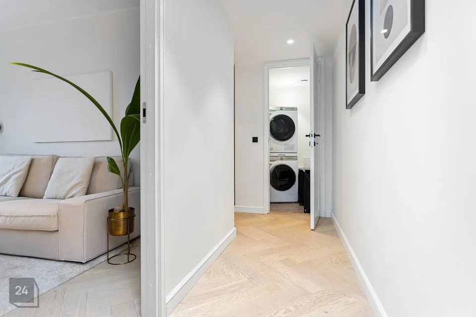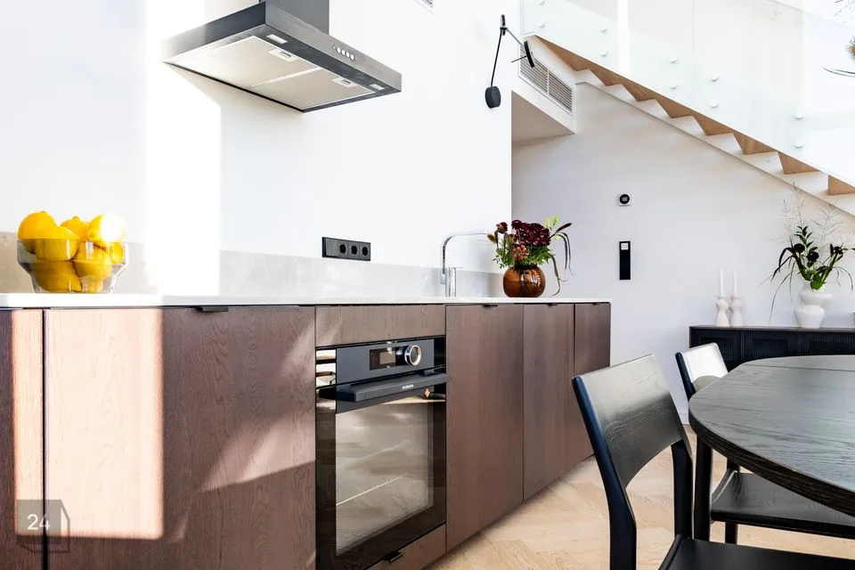 Korteri müügihinnas sisalduvad: integreeritud köögimööbel koos kvaliteetse tehnikaga, sealhulgas De Dietrich pliit ja ahi, integreeritud nõudepesumasin ja külmkapp ning trepi all asuv stiilne vitriinkapp.