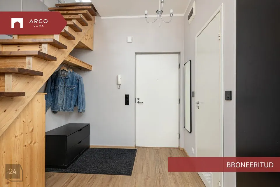 Korteri esimesel tasandil asuvad esik, duširuum/wc ja avatud köögiga elutuba. Teisel tasandil on katusealuse mahuka garderoobikapiga magamistuba. Esikusse, teisele korrusele viiva trepi alla, on ehitatud eraldi panipaik riiete ja asjade hoidmiseks.