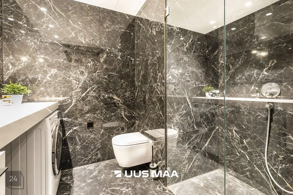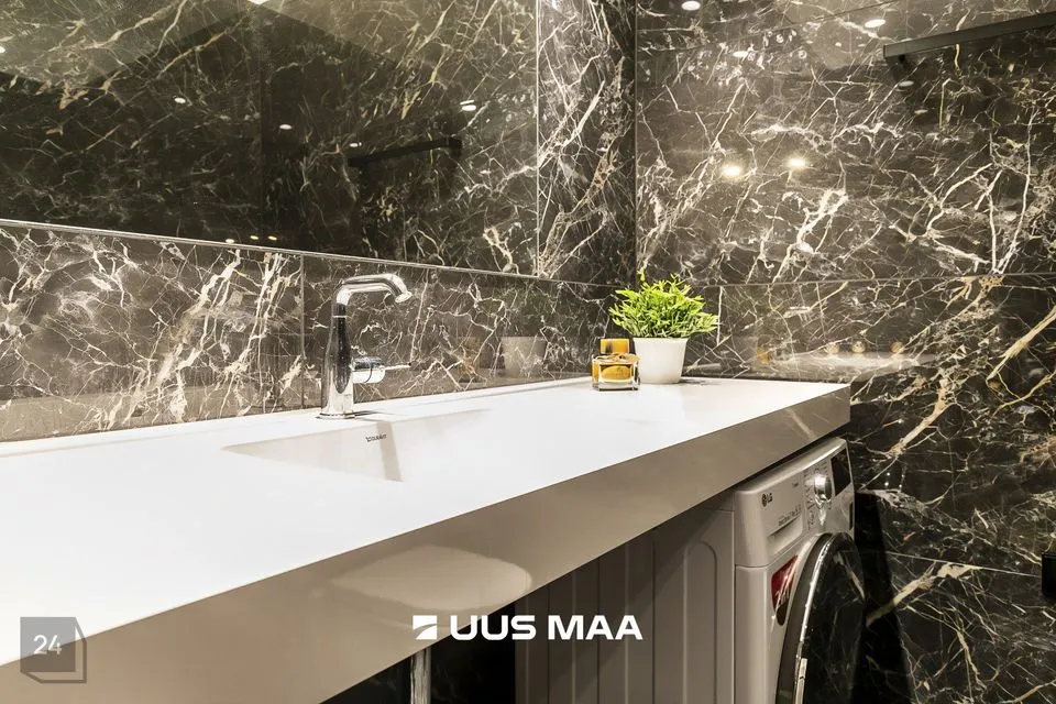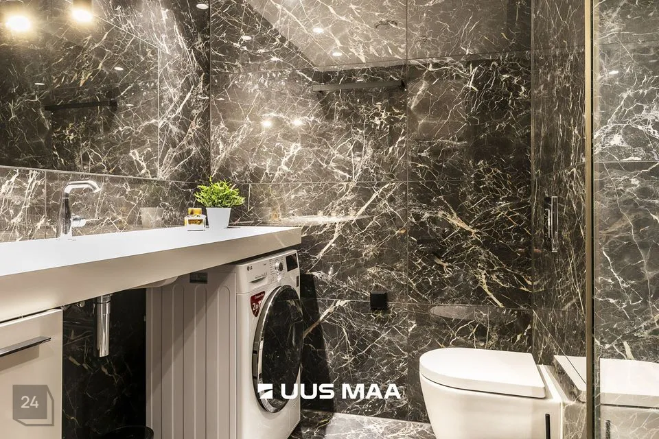 Põrandal on kasutatud laialipiline naturaalne tamme puitparkett, duširuumis on marmorimitatsiooniga tumedas tonaalsuses keraamilised plaadid.