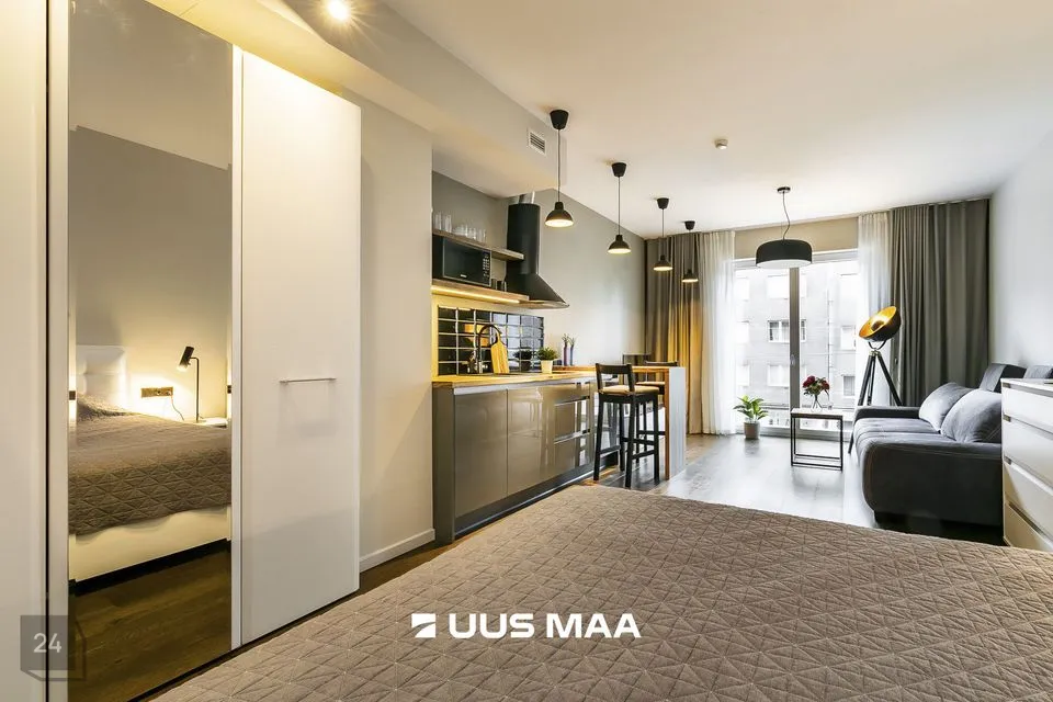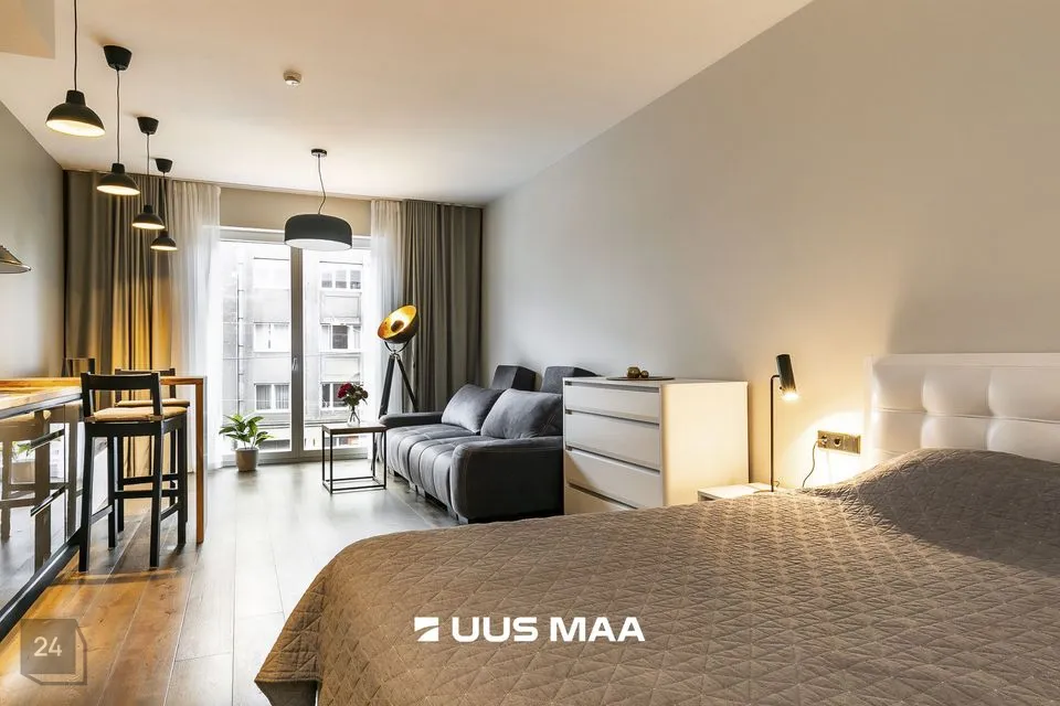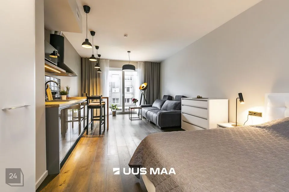 Müüa täielikult sisustatud 1-toaline stuudiokorter (korteriomand / eluruum) eksklusiivses Das Haus hoones südalinnas, Pärnu maantee ja Süda tänava nurgal. Köetav netopind on 37.80 m2.