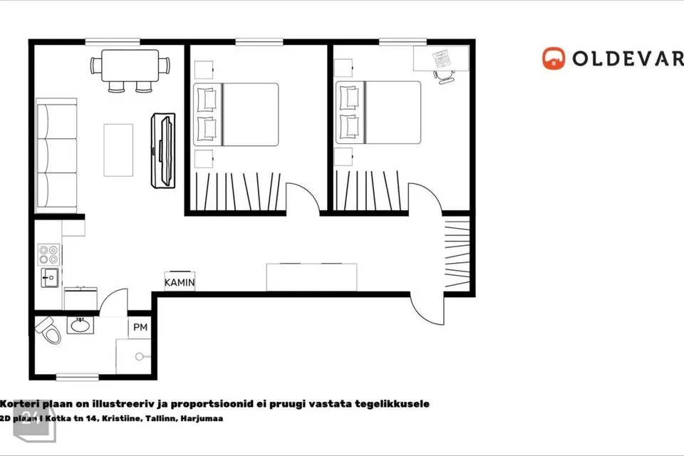 Planeering: esik, vannituba, avatud köögiga elutuba ning kaks magamistuba.