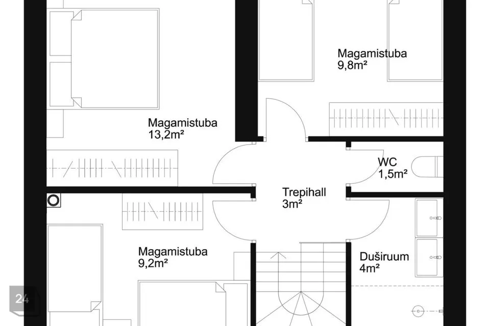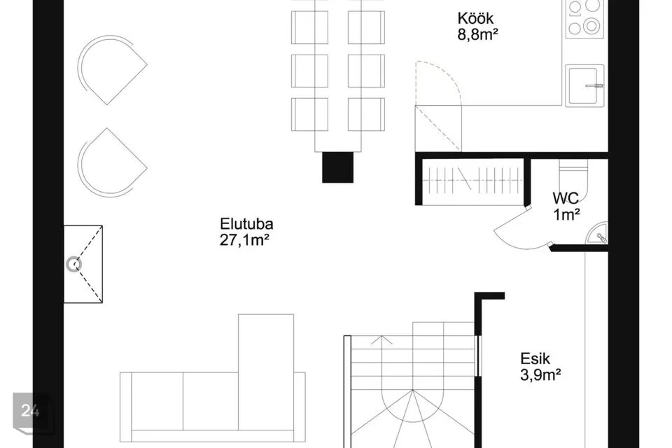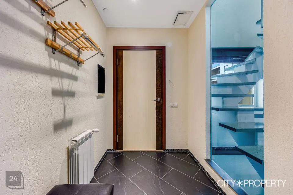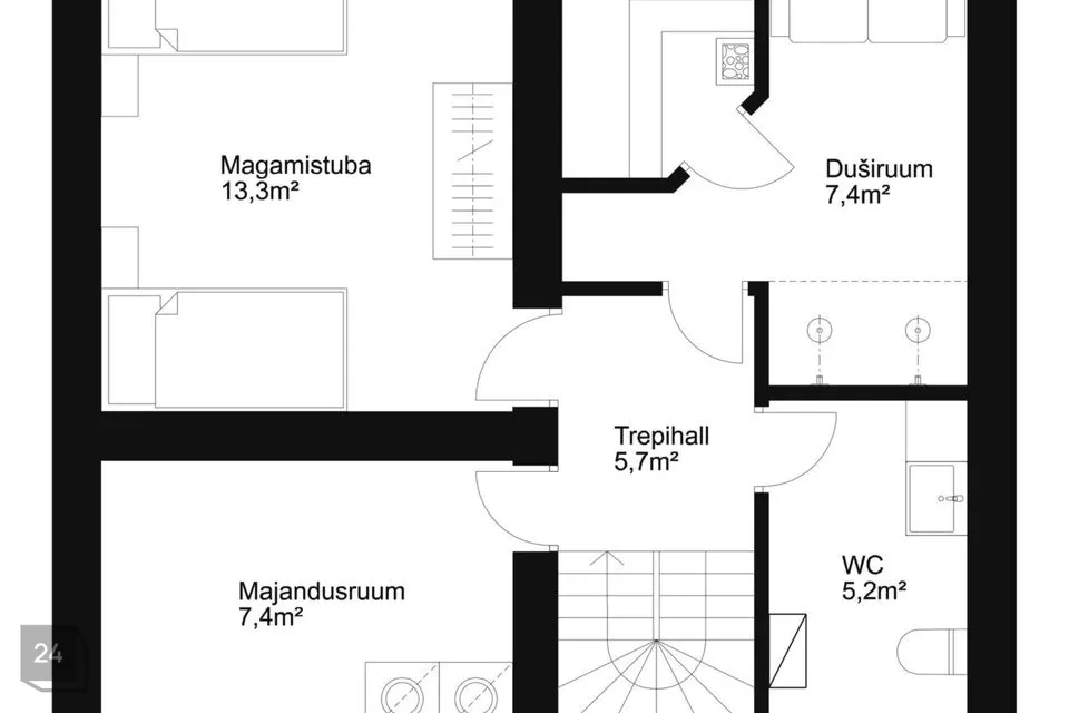 Korteri sissepääsu korrusel asub suur elutuba koos köögialaga, ning esik koos integreeritud gardoobiga ja eraldiasuva väikse tualettruumiga. Soklikorrusel asub üks magamistuba, mille võib kohandada näiteks jõusaaliks. Lisaks asuvad siin avarad saunaruumid, eraldiasuv tualettruum ning majandusruum pesumasinatega. Ülakorrusele jäävad kolm magamistuba ning eraldiasuvad duširuum ja WC. Sisetrepp on õhulise konstruktsiooniga ning lihvitud paeplaadist astmetega.