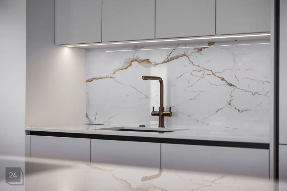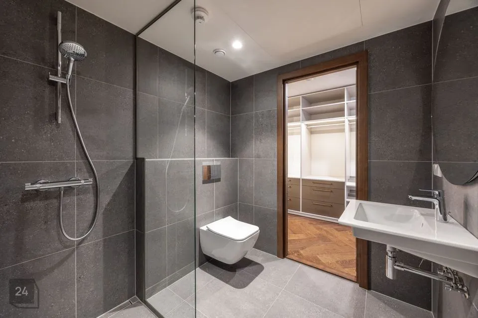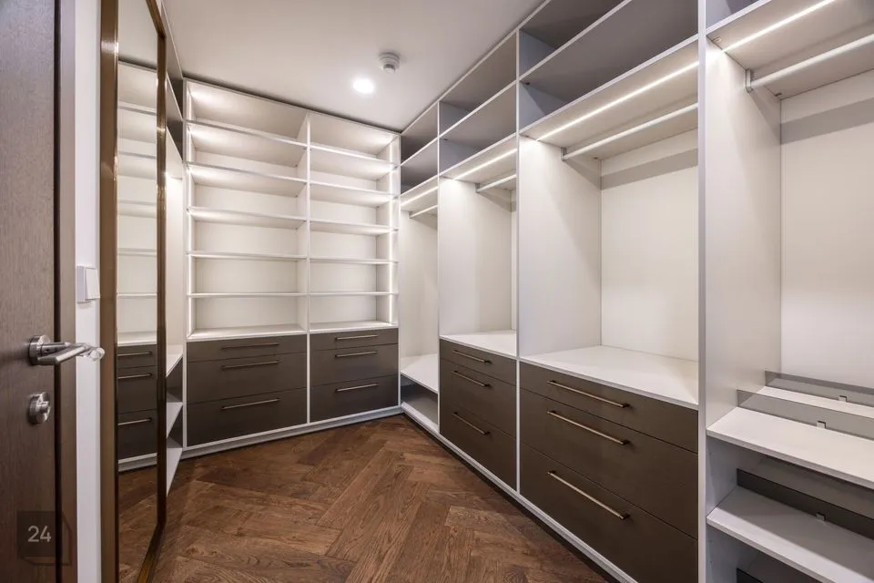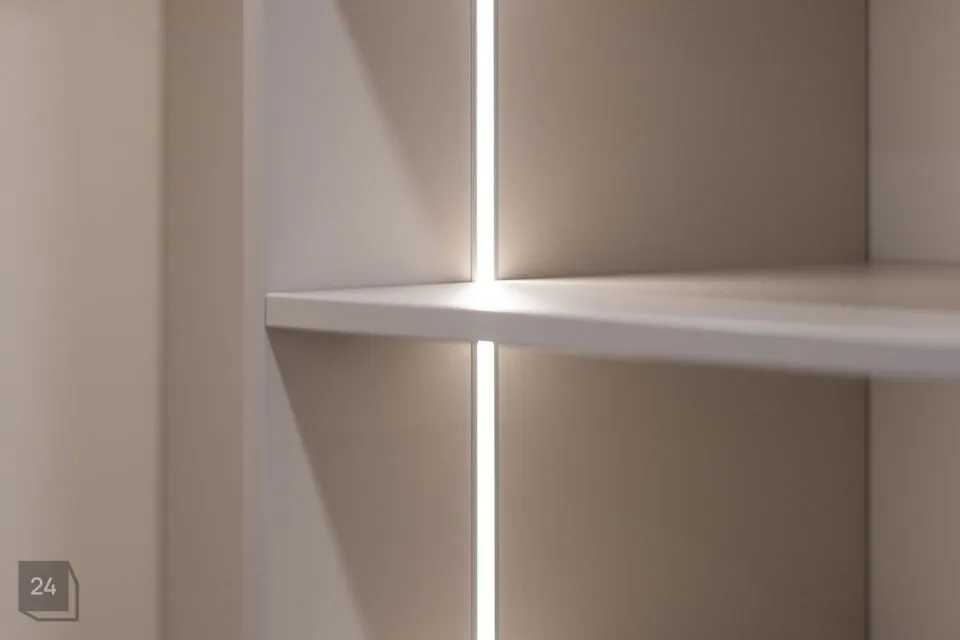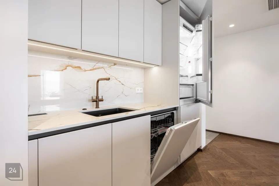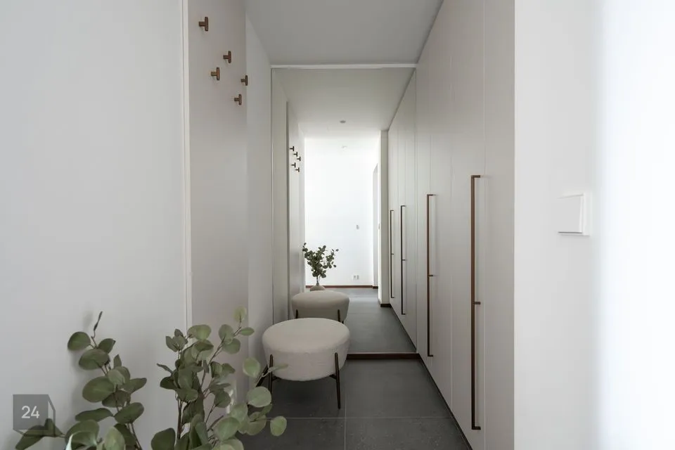 Ka kõik ülejäänud sisseehitatud mööbel – garderoobid, riiulid ja muu sisustus – on samuti pärit Schmidtilt, tagades kogu korteris ühtlase stiili ja kõrgetasemelise viimistluse.