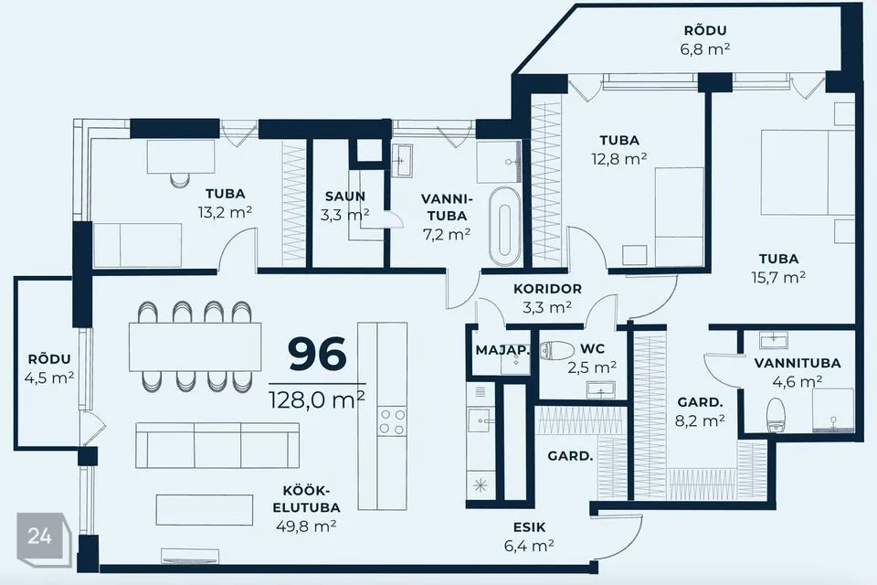 Korteri suurus on 128 m², millele lisanduvad kaks rõdu.