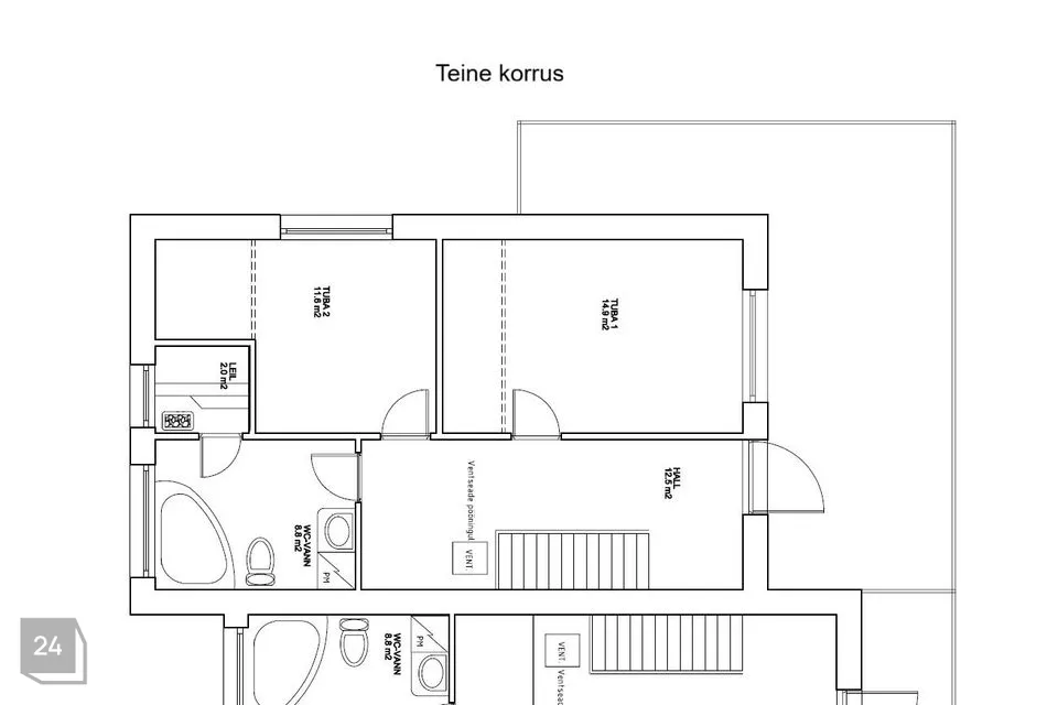 Teisel korrusel on 2 magamistuba ja vannituba, kus on mullivann, dušš, tualett ja saun. Trepihallist on pääs suurele terrassile (ca 29m2), millelt avanevad maalilised vaated hoovialale.