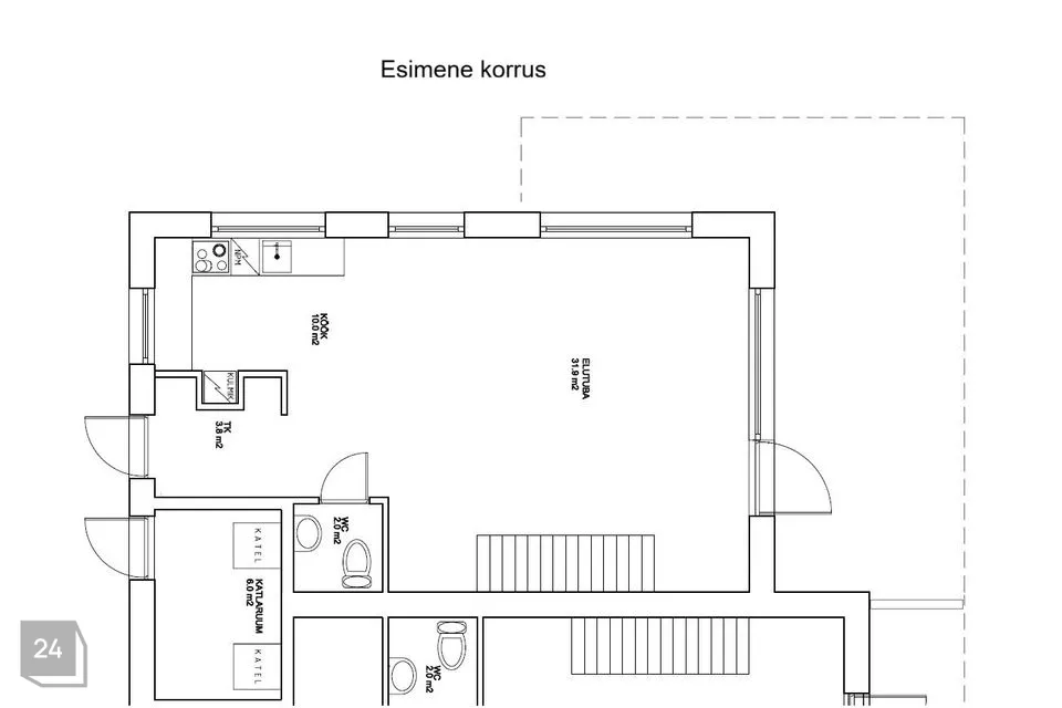 Esimesel korrusel asub lisaks tualettruum, esik, garderoob ja eraldi sissepääsuga katlaruum.