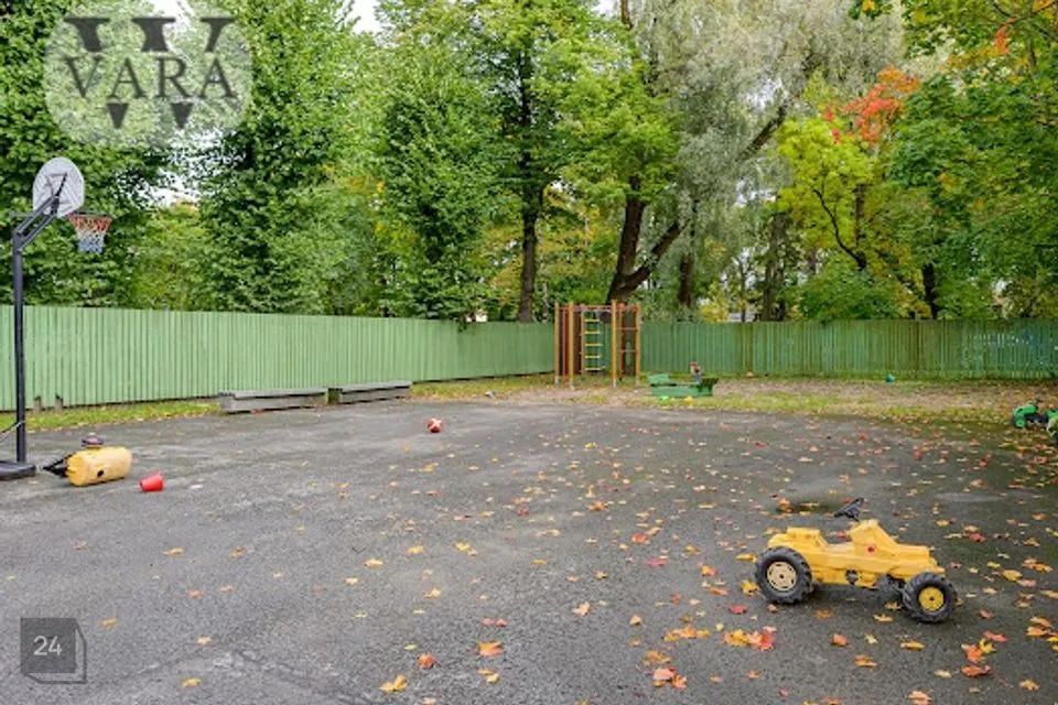 Hoovis on aiaga piiratud roheala, mänguväljak ja rattaparkla.