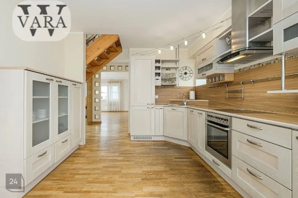 Köögis on kvaliteetne mööbel koos integreeritud tehnikaga (pliit, ahi, nõudepesumasin, külmik).
