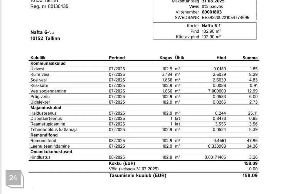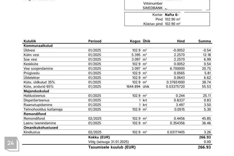 Arved: Talv ca 220€ / Suvi ca 170€, kui korteris elas 3-liikmeline pere. Lisandub elekter vastavalt tarbimisele.