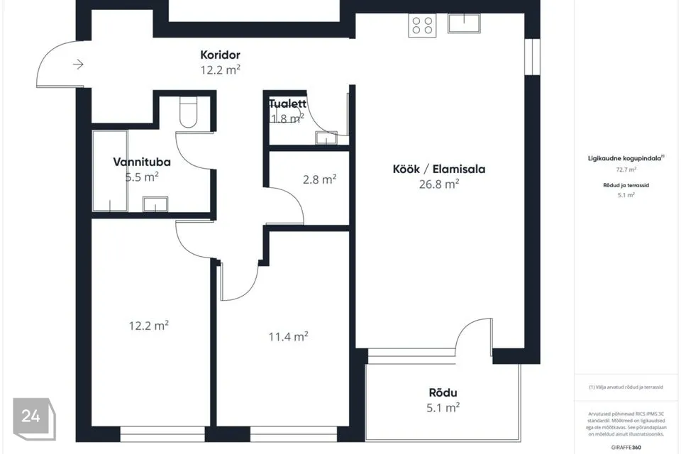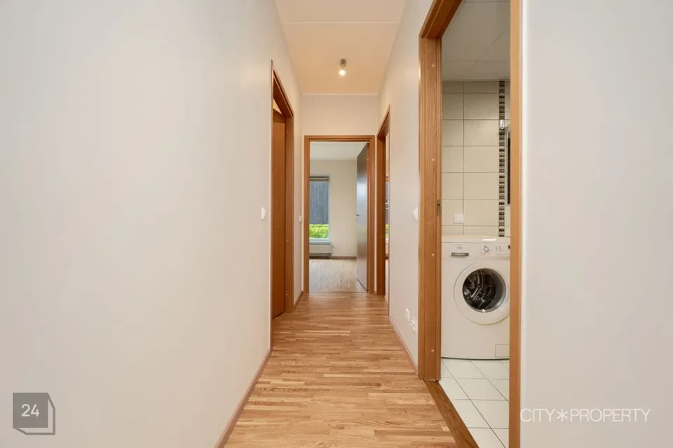 Korteri koosseisu kuulub avatud köögiga elutuba koos kaasaegse köögimööbli ja kvaliteetse tehnikaga. Elutoast pääseb 5 m2 suurusele rõdule. Lisaks kaks eraldi paiknevat magamistuba, esik, vanniga pesu- ja tualettruum ning eraldiseisev tualettruum. Korteris sees asub lisaks 2.8 m2 suurune panipaik/garderoob. Köögis Idema köögimööbel koos tehnikaga (ahi, pliit, kubu, nõudepesumasin ja külmik).