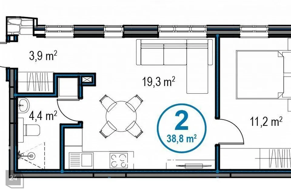 Paikneb elamu 1.korrusel, aknad on vaatega maja ette ja ühele küljele. Korter koosneb esikust, avatud köögiga elutoast, magamistoast ja tualett-duširuumist - üldpinnaga kokku 38,8 m2.