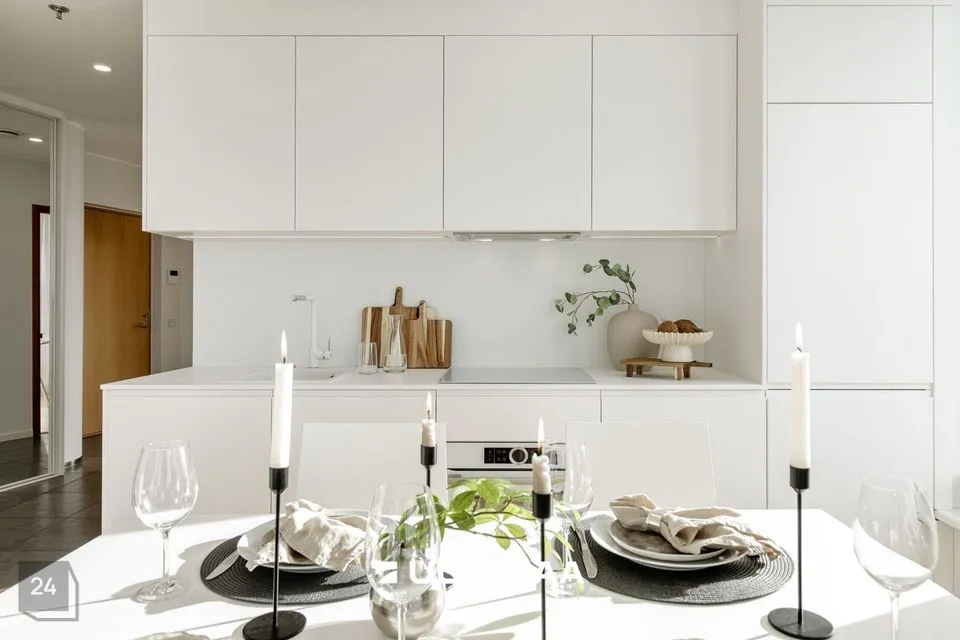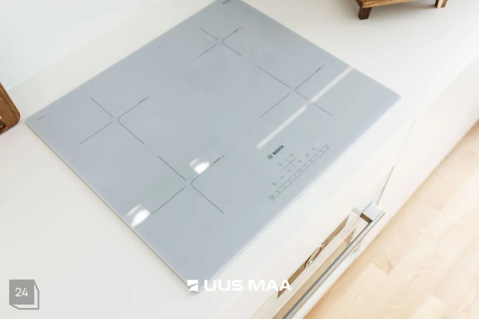 The kitchen is equipped with high-quality appliances: a Bosch induction stove and oven, range hood and Electrolux refrigerator. Two floor-to-ceiling wardrobes provide ample storage space, eliminating the need for a separate storage room.
