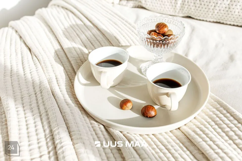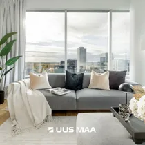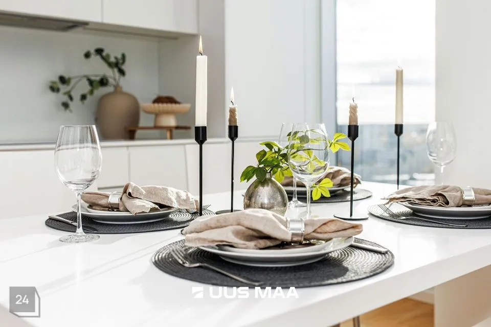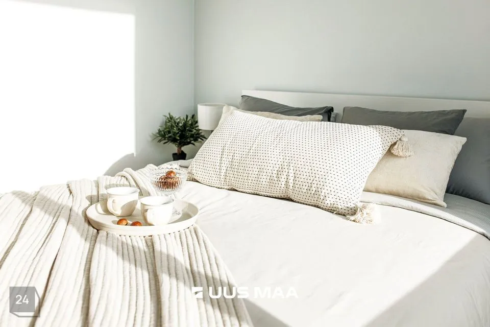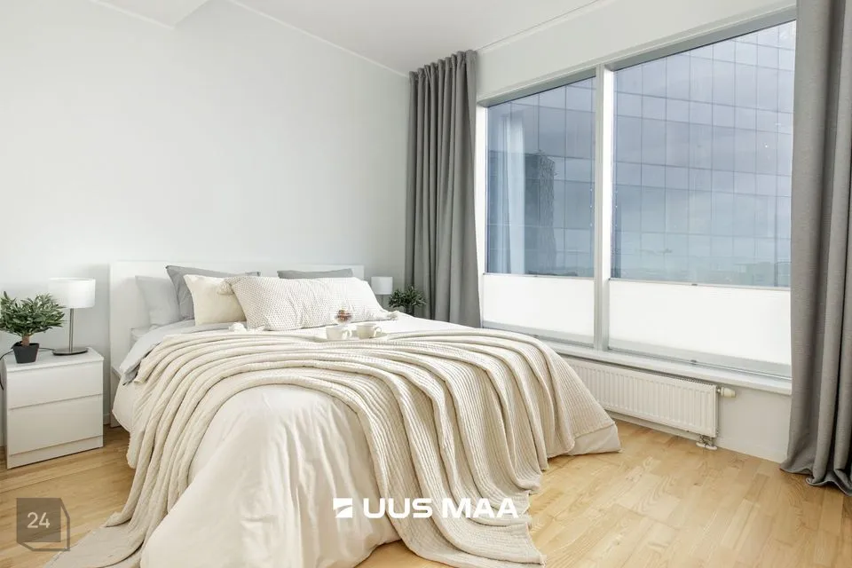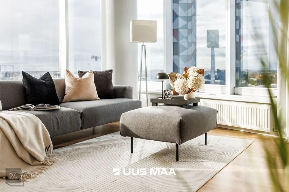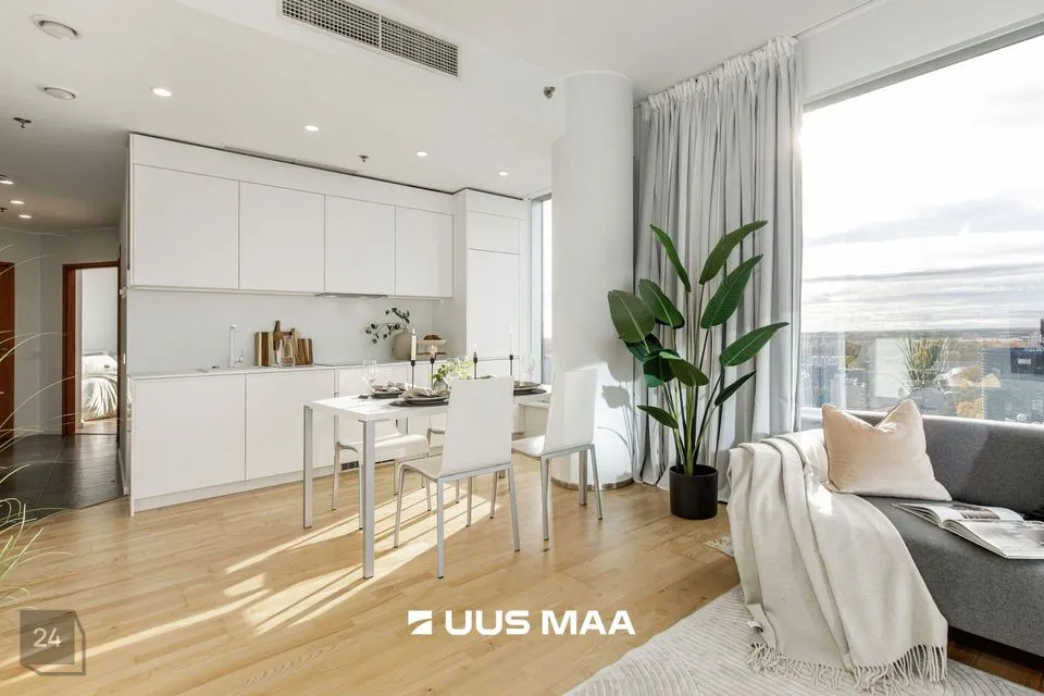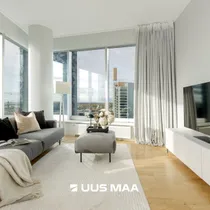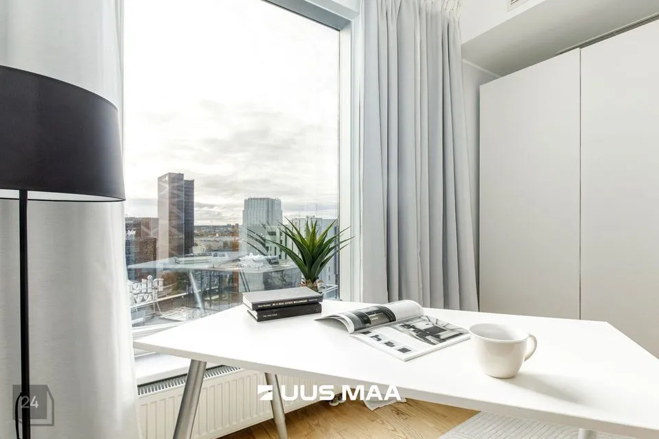 The apartment is decorated in light tones and feels bright and airy. The large floor-to-ceiling windows offer magnificent views of the Maakri business district’s skyscrapers, the beautiful Tallinn city center and Old Town, as well as the sea.