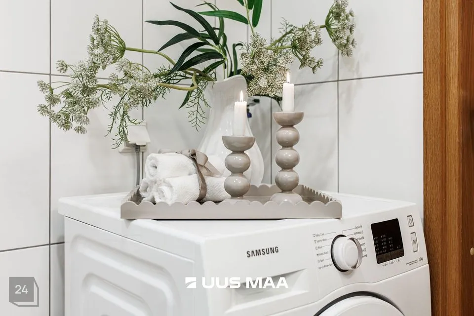 The interior is finished in light tones with natural parquet flooring. The bathroom includes underfloor heating, a shower, sink, Samsung washing machine, and toilet.