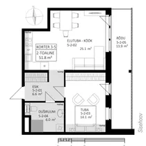 Astangu 50B/3- 5 korter on 2-toaline, mille juures on 13,9m2 suurune rõdu.