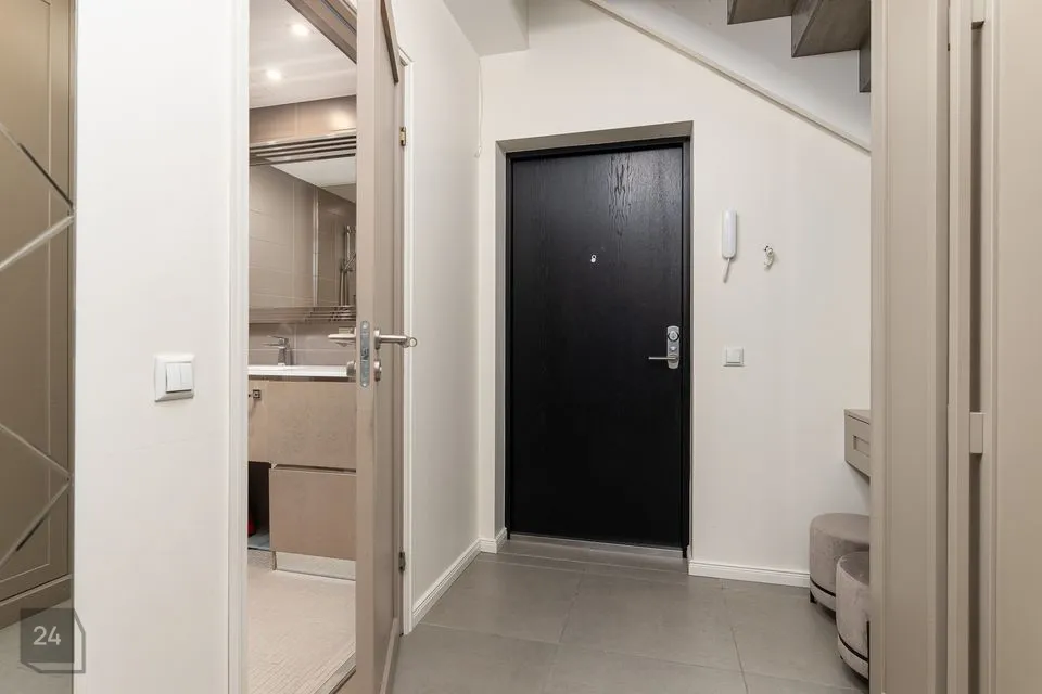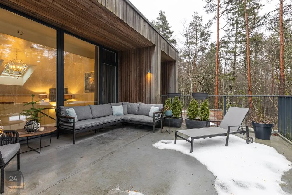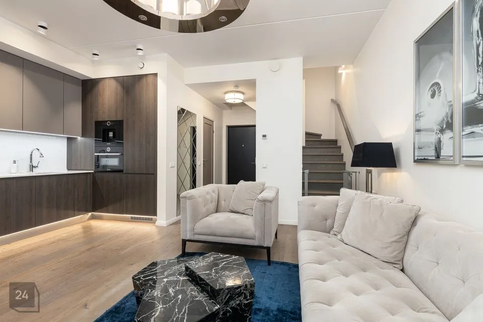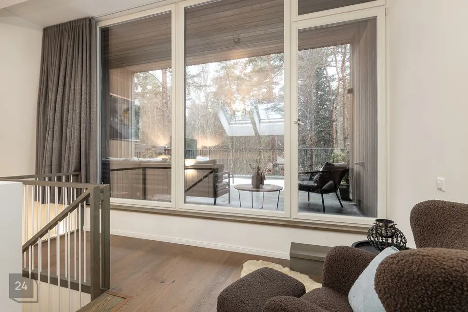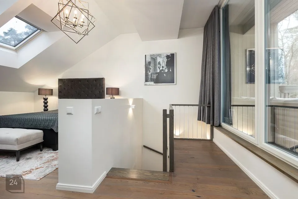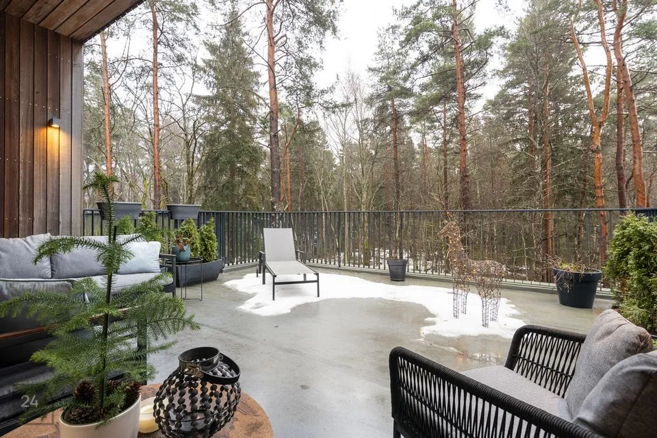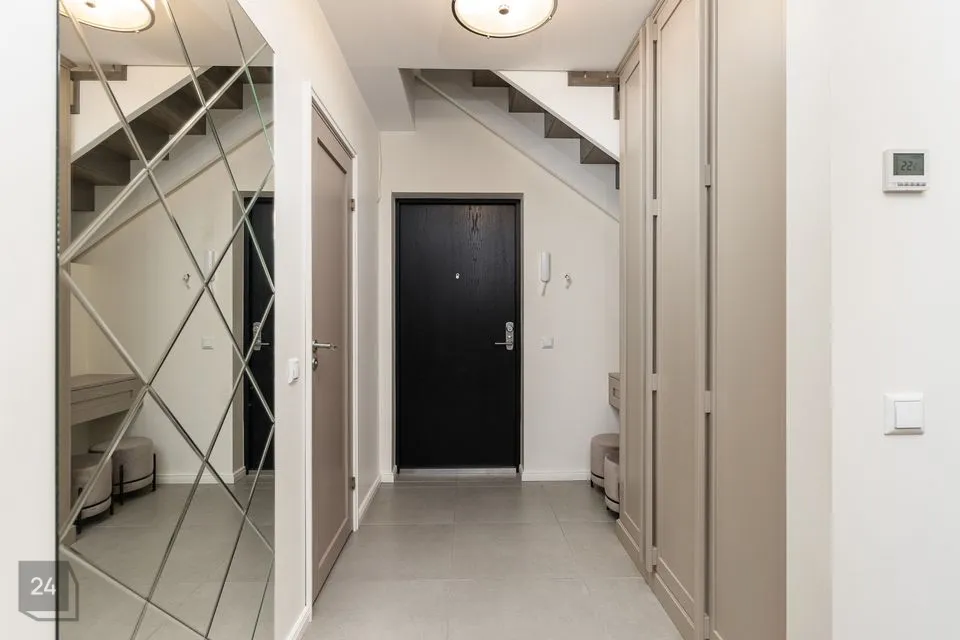 See disaineri käe all valminud avar korter paikneb läbi kahe korruse, olles loodud nii, et lõunapäike valgustab suure terrassi (32,2m2) ja elutoa läbi suurte akende. Esimesel korrusel asub avar elutuba koos stiilse avatud köögiga kokku (28,1m2), teisel korrusel on kõrgete lagedega valgusküllane magamistuba (29,4m2), mille juurde kuulub päikeseline terrass (32,2m2)