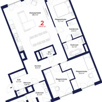 Allveelaeva 2-2 korteri planeeringus paiknevad väiksemad magamistoad vaatega sisehoovi, elutoa ja suure magamistoa aknad avanevad lõunasse, Allveelaeva tänava poole. Suur magamistuba on eraldi vannitoa, rõdu ja ja walk-in garderoobiga.