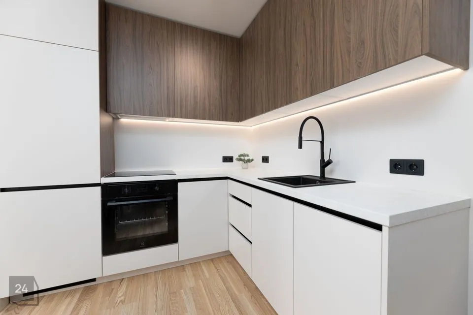 Elutuba on ühendatud avatud köögiga, mis on varustatud eritellimusel valmistatud köögimööbli ja kaasaegse tehnikaga, sh integreeritava nõudepesumasina, köögikubu ning eraldiseisva integreeritava külmkapiga. Pesumasin on paigaldatud esiku garderoobikappi.