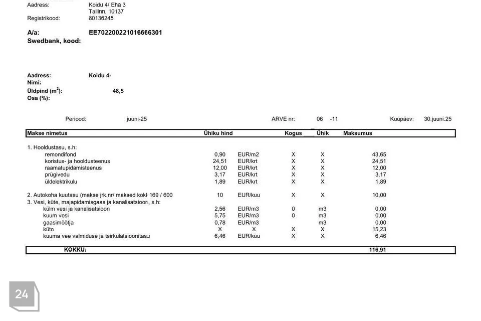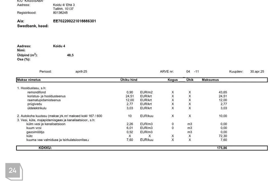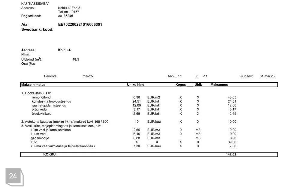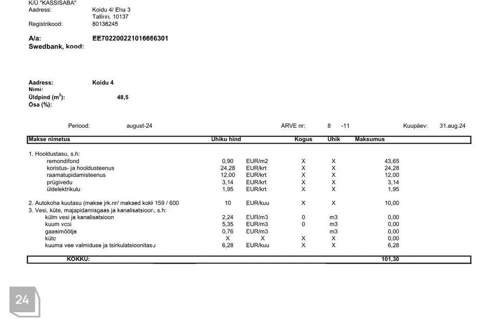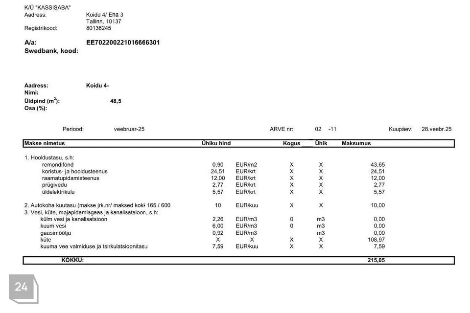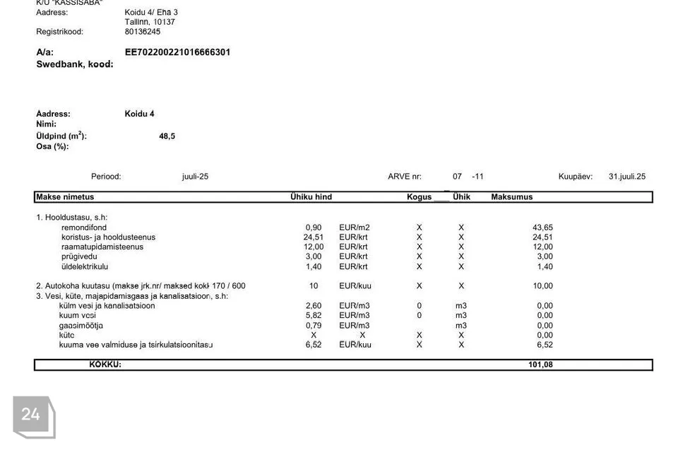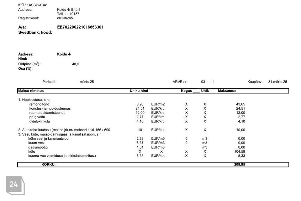 Kõrvalkulude arvetest fotod on lisatud kuulutuse fotode hulka tutvumiseks. Suvised püsikulud on jäänud 100 euro ning talvised 220 euro suurusjärku, millele lisanduvad mõõdetavad teenused (vesi, kanal, elekter jmt). Interneti ühendus on võimalik nii üle õhu (alla laadimise kiirusega kuni 500 Mbit/s ja üles kuni 100 Mbit/s) kui ka kaabliga (alla laadimise kiirusega kuni 200 Mbit/s ja üles kuni 50 Mbit/s). 2024.a on (elaniketa) korteri majandamiskulu kokku korteriühistu aasta aruande kohaselt olnud 1823 eurot.
