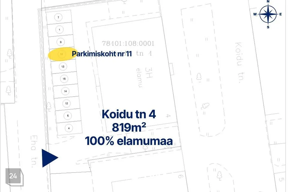 Korteri juurde kuulub notariaalselt erikasutusõigusega kindel parkimiskoht nr 11 sisehoovis, kuhu pääseb Eha tänavalt elektriliselt avaneva sõiduvärava kaudu.