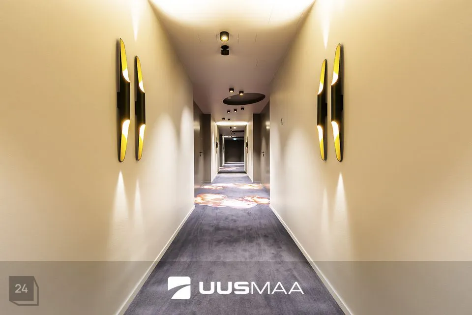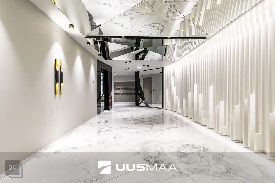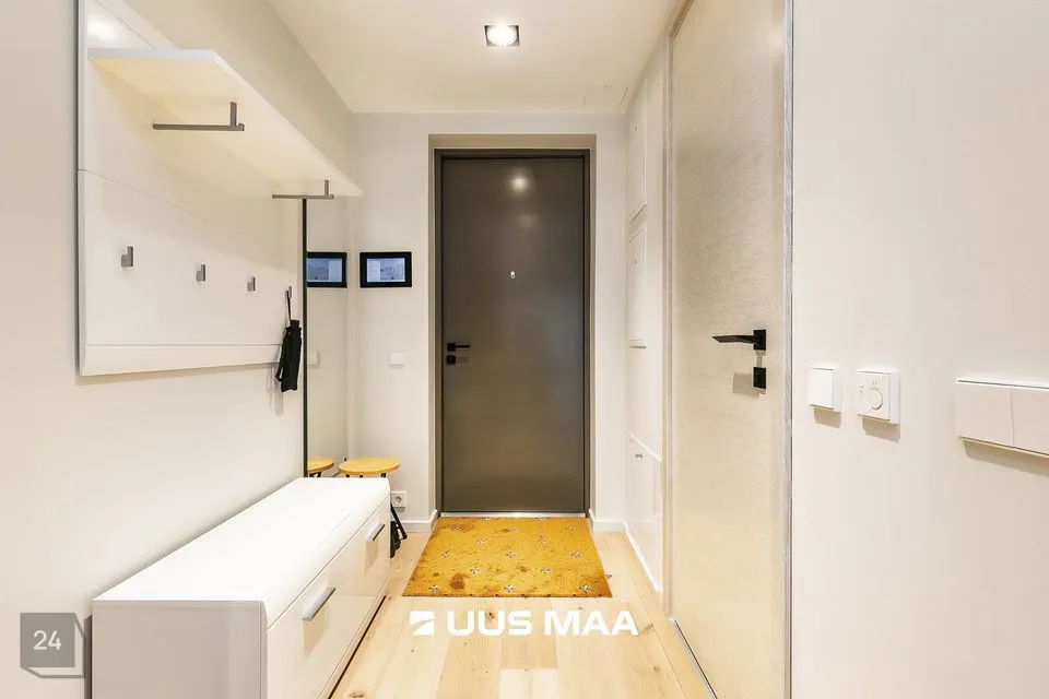 Korteris on garderoobikapiga ruumikas esik, avar avatud köögiga elutuba ja suur duširuum. Korter asub privaatselt luksusliku vaibaga kaetud 3. korruse koridori lõpus.