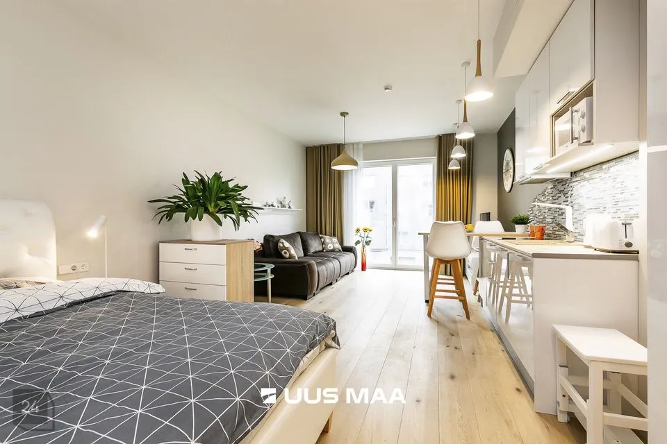 Müüa täielikult sisustatud 1-toaline stuudiokorter (korteriomand / eluruum) eksklusiivses Das Haus hoones südalinnas, Pärnu maantee ja Süda tänava nurgal. Köetav netopind on 36.80 m2.