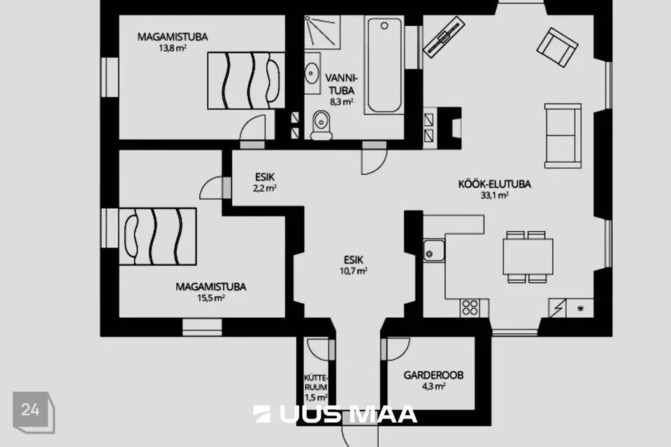 Planeering on funktsionaalne: avar elutuba koos kaminaga ning avatud köögiga, kaks magamistuba, sanitaarruum vanni ja dušinurgaga, eraldi pesuruum pesumasina ja kuivatiga (võimalik kasutada ka panipaigana), privaatne terrass, esik suurte lükandustega garderoobikappidega