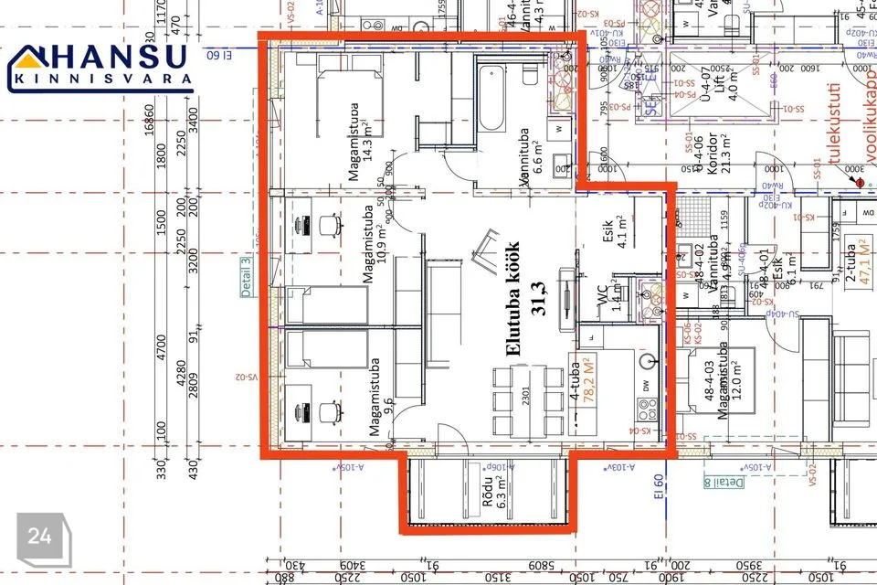 Korteri köetavpind on 78,2 m2 millele lisandub rõdu 6,3 m2.